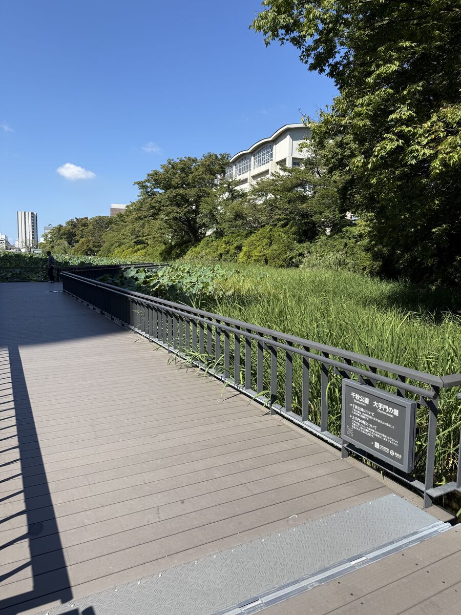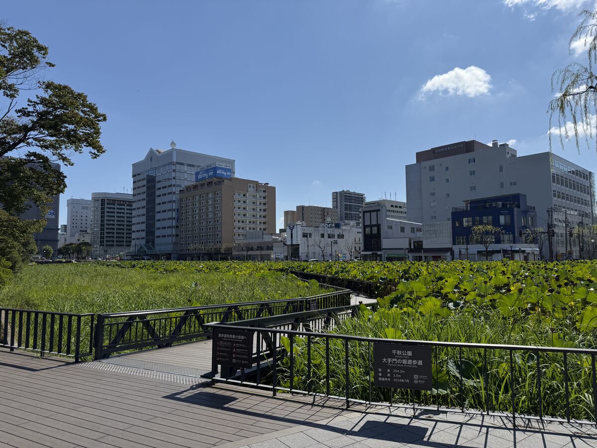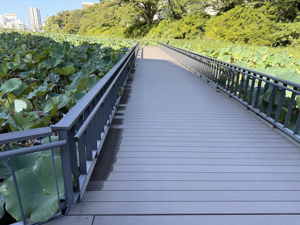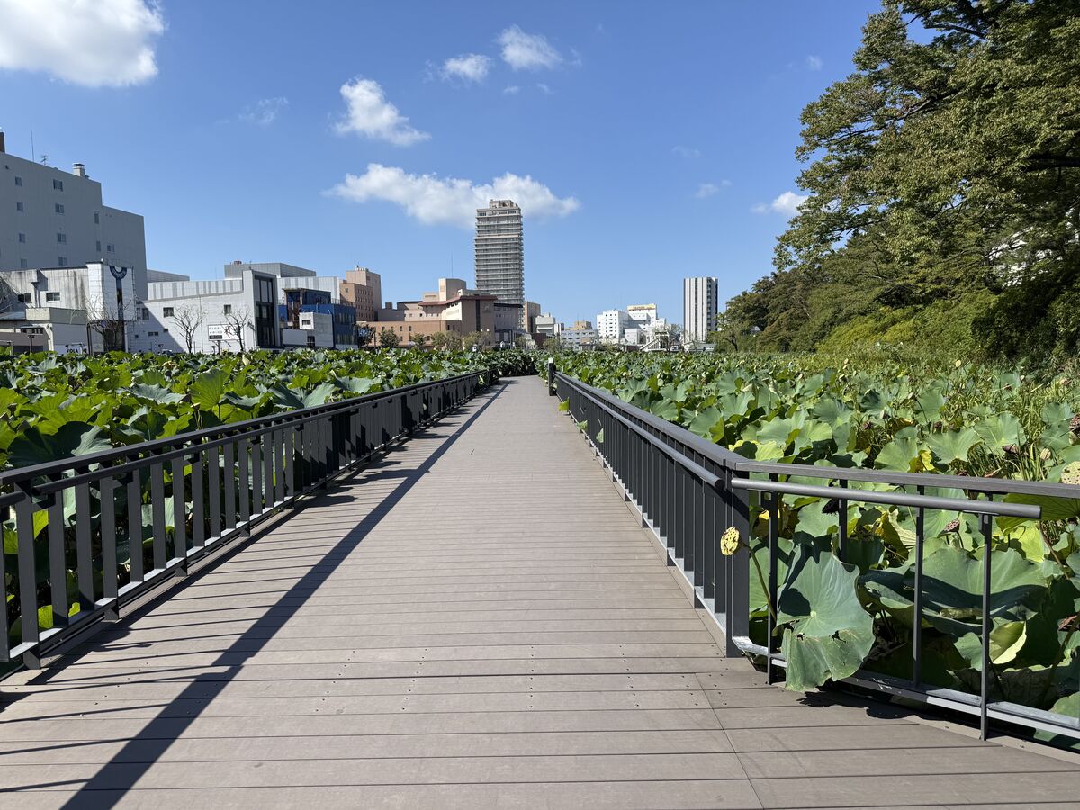 浮桟橋は城下町の面影を残す千秋公園の大手門堀に整備され、夏季には蓮の花が咲き誇る中、間近で観賞できる場所として多くの市民や観光客に親しまれています。毎年開催される蓮まつりの時期には特に賑わいを見せ、この高欄が安全で快適な観賞体験をサポートしています。