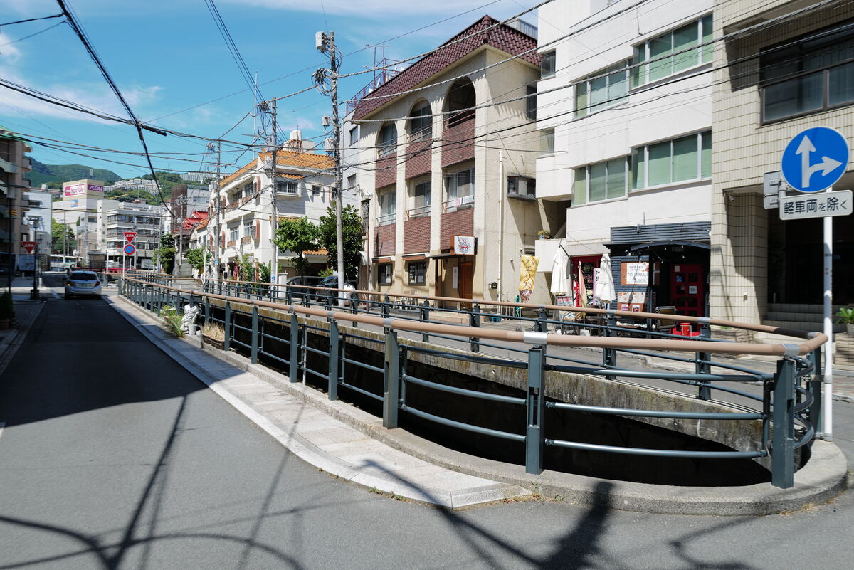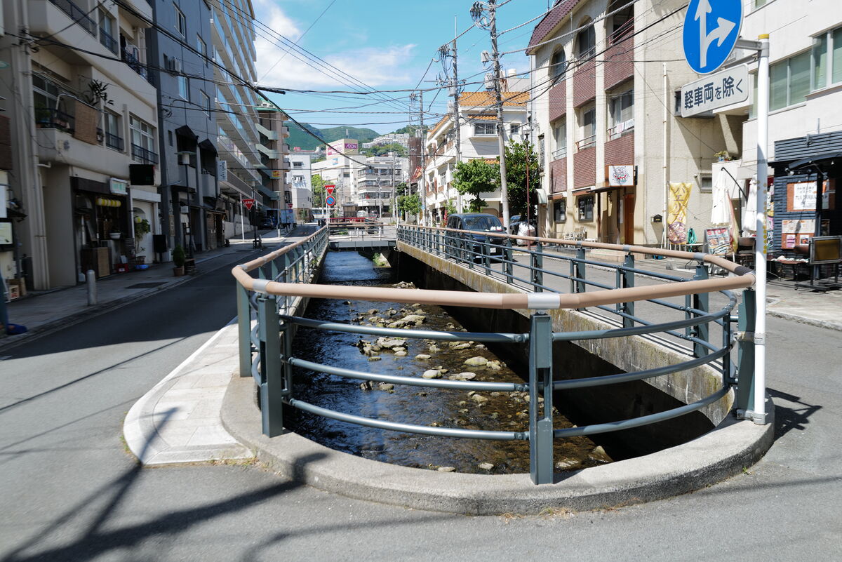 温泉街として知られる熱海市の初川沿いは、夜間の散策も多い地域です。以前の木製手すりが朽ちていたため、耐候性に優れたアルミ形材と再生木材を組み合わせた製品への更新が行われました。