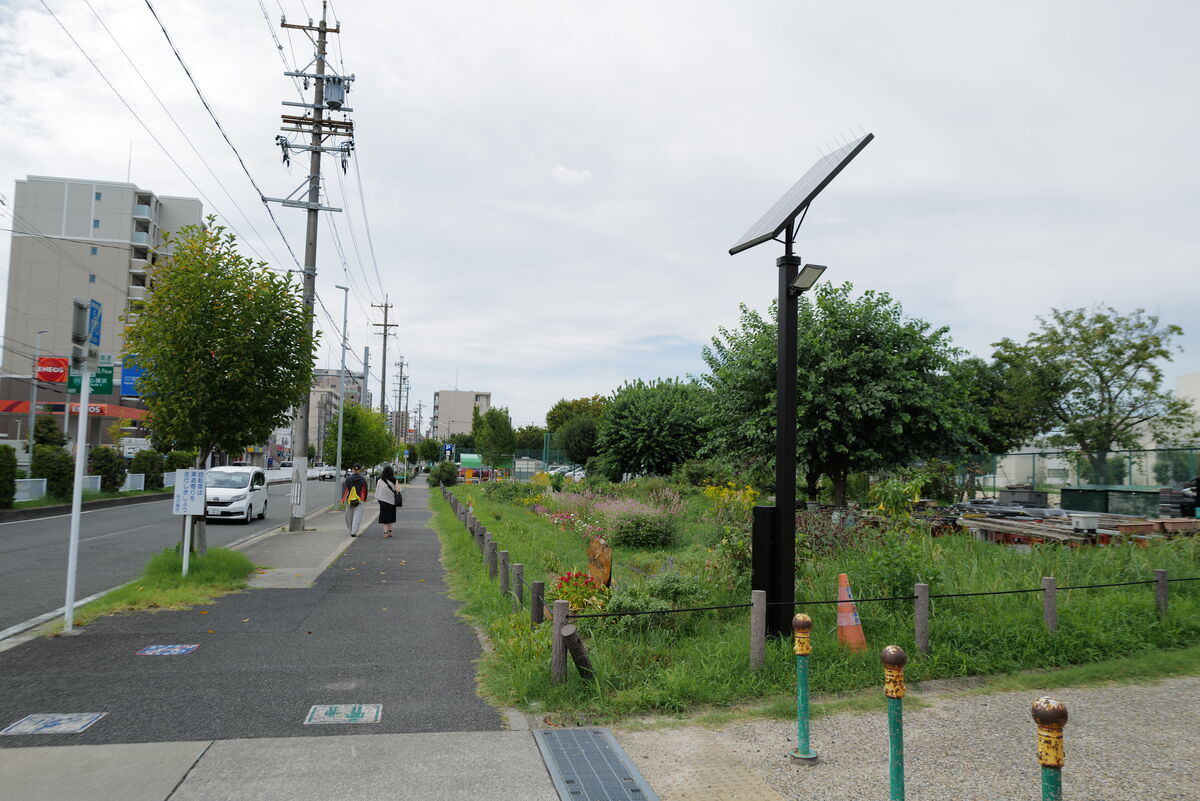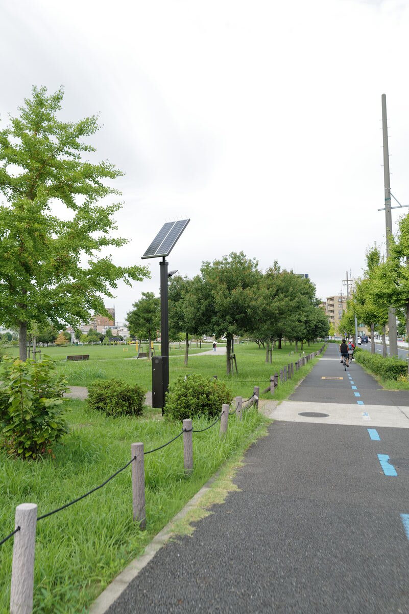 納入した『ソライト』は太陽光で発電し、本体に内蔵された蓄電池に電力を貯め、夜間に照明を灯す独立電源式の照明灯です。電力会社の送電網とは切り離されているため、停電の影響を受けずに周囲を照らし続けることができます。防災公園という性格上、災害時にも確実に明かりを確保できる独立電源式の照明は、避難場所としての機能を高めるうえで重要な役割を果たしています。
