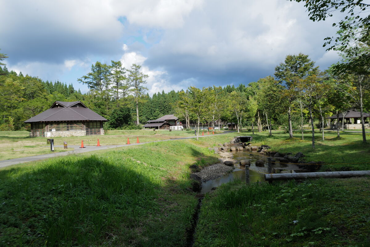 施設内を流れる小川沿いの園路や芝生広場に沿って配置されています。
