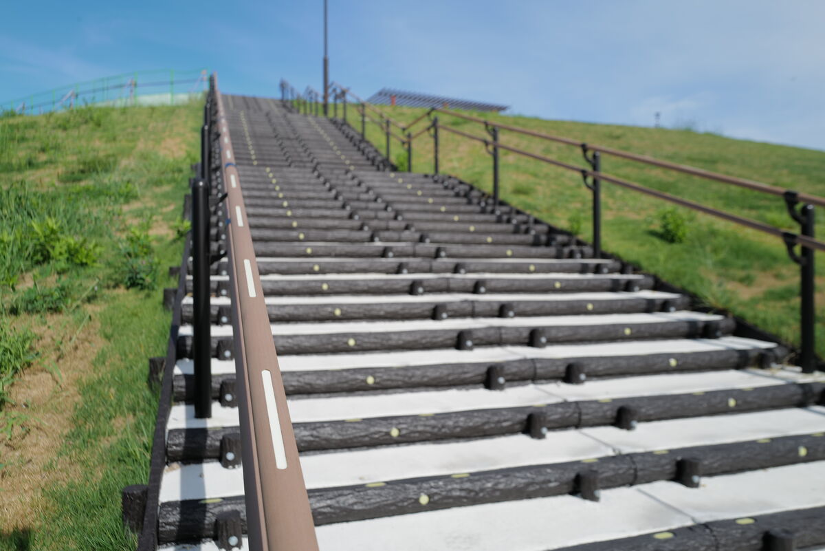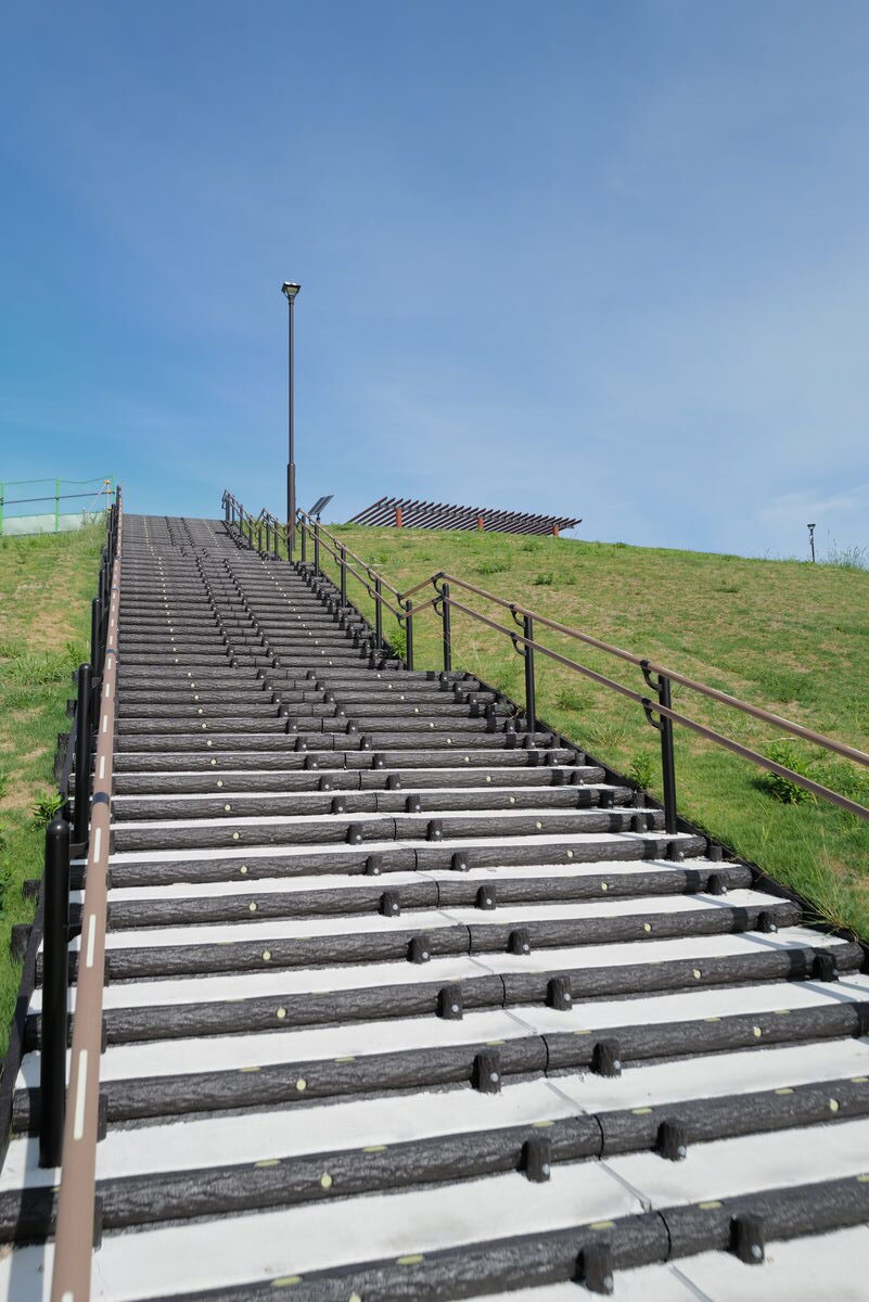 命山へと上がる階段には、再生木材製ユニバーサル手すり「セコロウッド憩木」を納入しました。