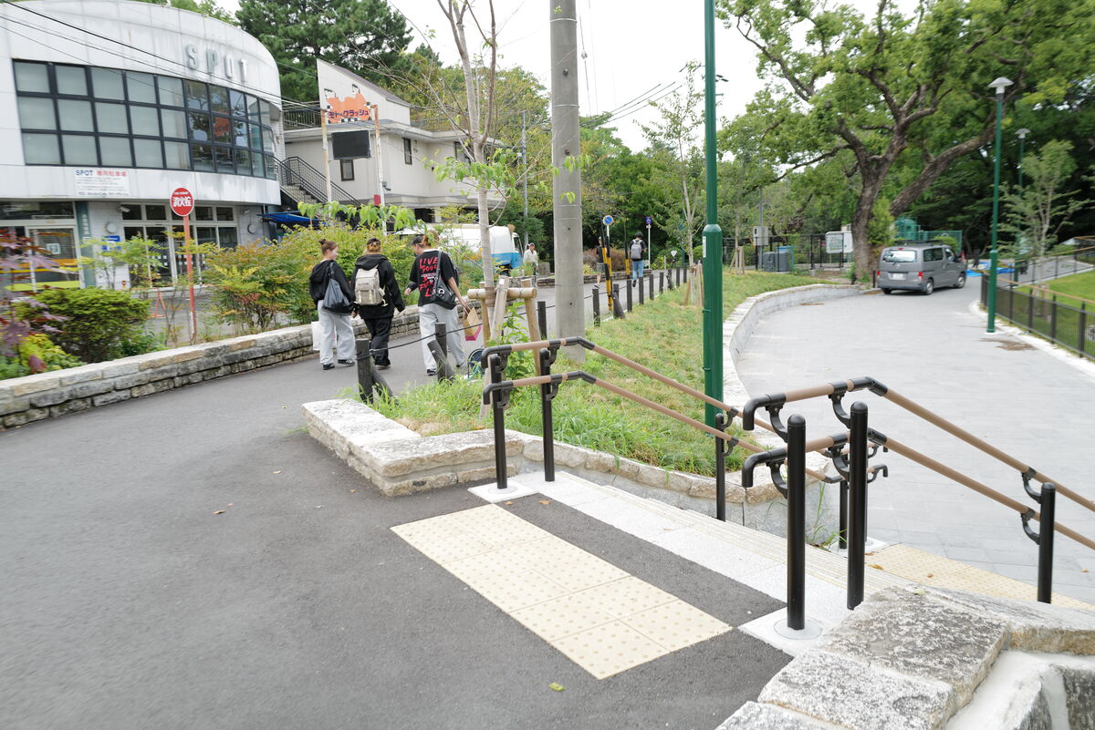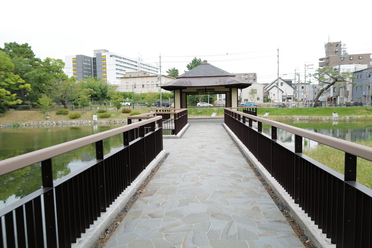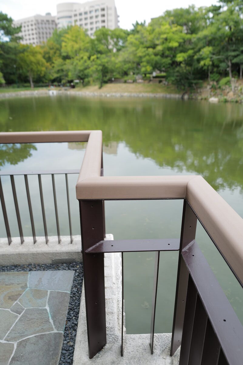 池を渡る橋には伝統的な意匠の東屋が建ち、その橋の高欄笠木部分に再生木材「セコロウッド」のライトブラウンカラーを採用することで、周辺の歴史的景観に調和する温かみのある空間が生まれました。