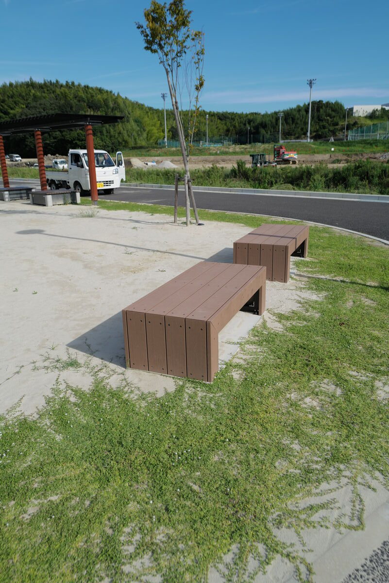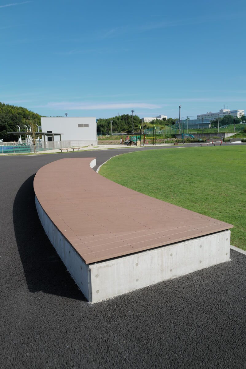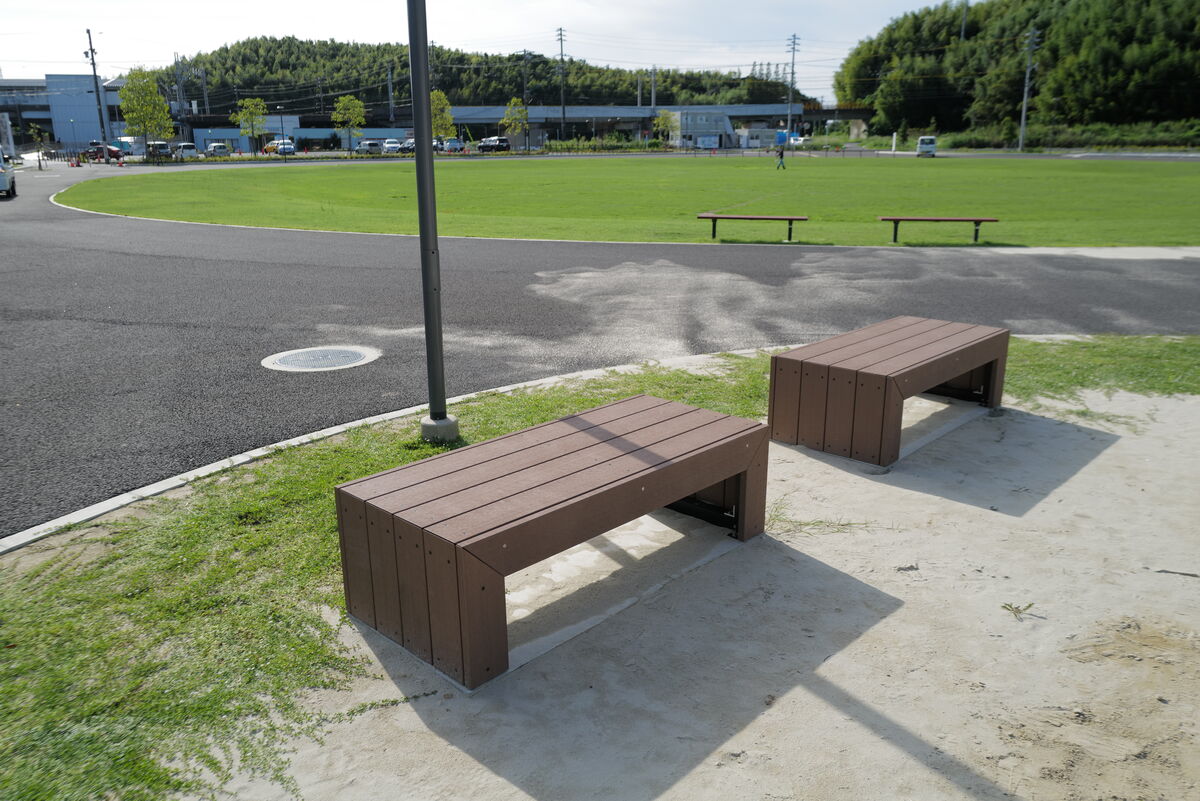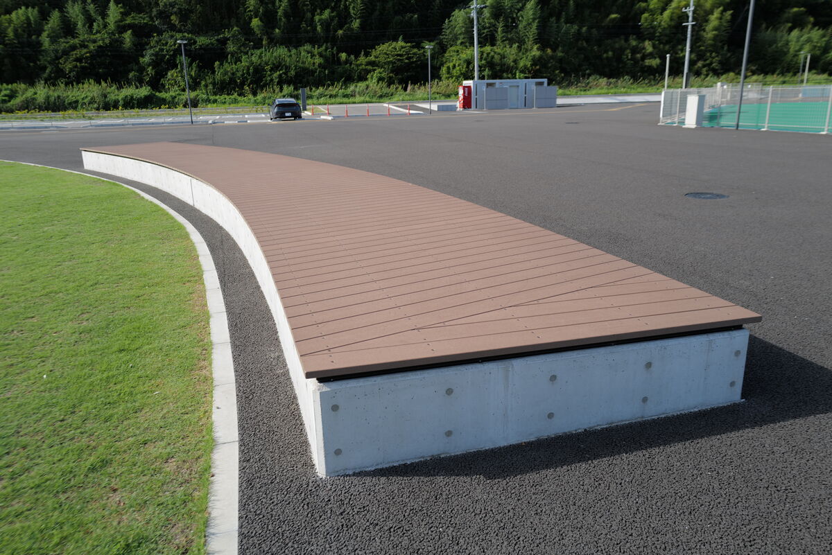 見守り用の大型座板ベンチは約15.5メートル×2メートルのR形状で、なめらかな曲線を描きながら広場を囲むように配置されています。