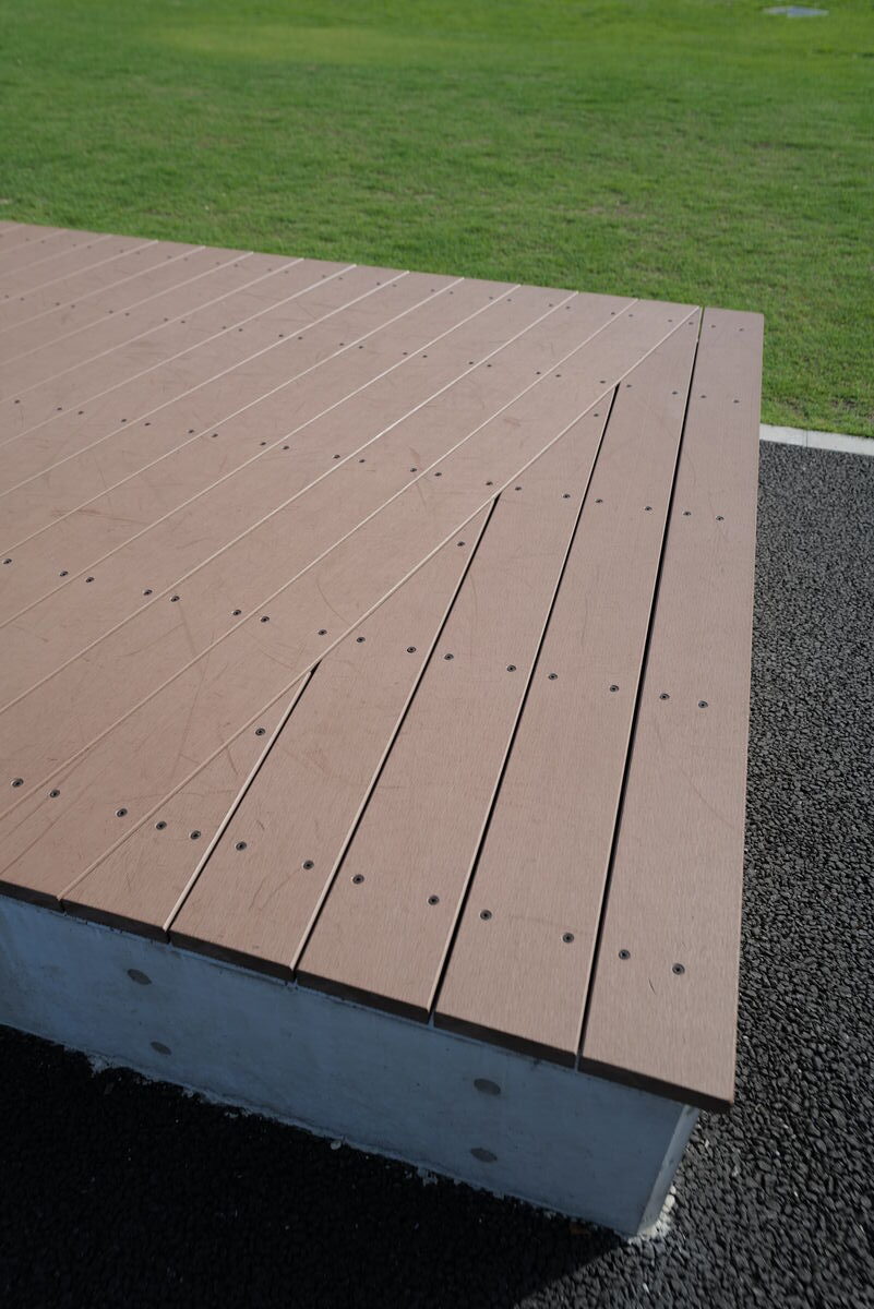 コンクリート躯体の上に据え付けられた座板は、運動を楽しむ子どもたちを見守る保護者の方々の休憩スペースとして、また施設利用者同士の語らいの場として活用されています。