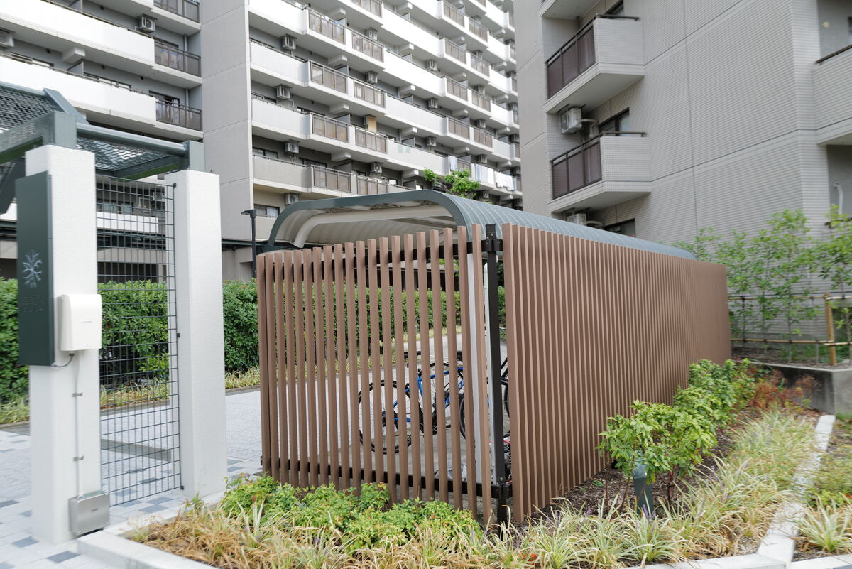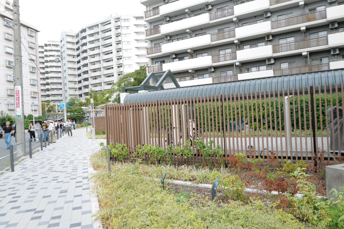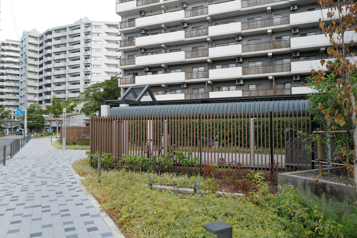 エントランス周辺には、アルミユーティリティーズのルーバーフェンスを納入しました。この製品は再生木材とアルミ形材を組み合わせた縦格子のルーバーフェンスで、適度な目隠し効果を持ちながらも閉鎖的にならない抜け感が特徴です。