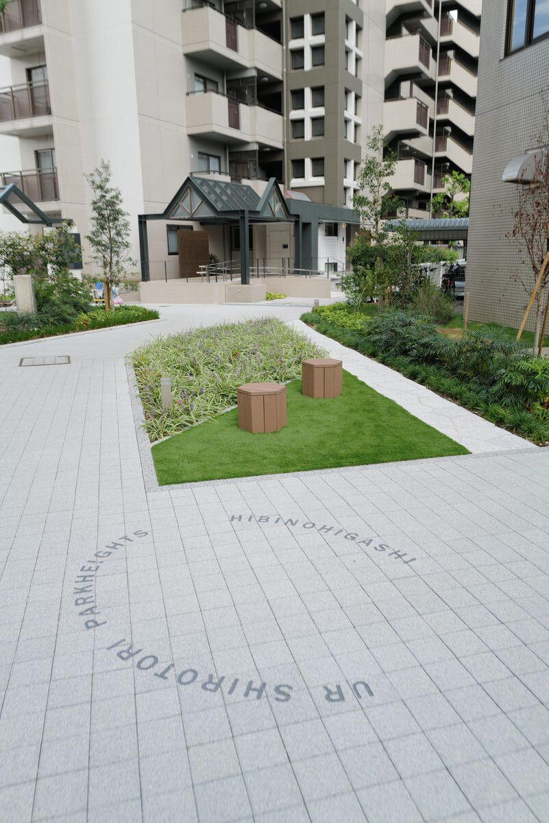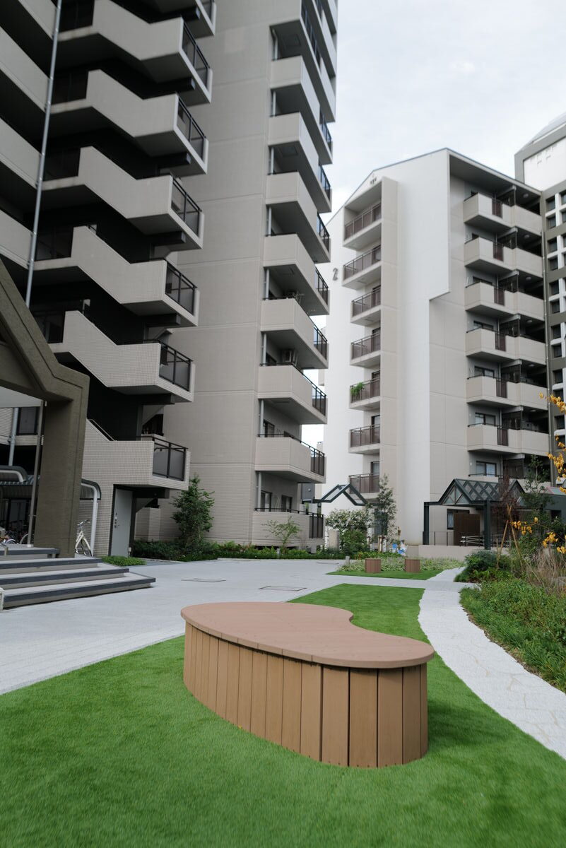 廃木粉と廃プラスチックから生まれた再生木材の温かみのある質感が、住宅地の外構空間に優しい印象を与えています。
