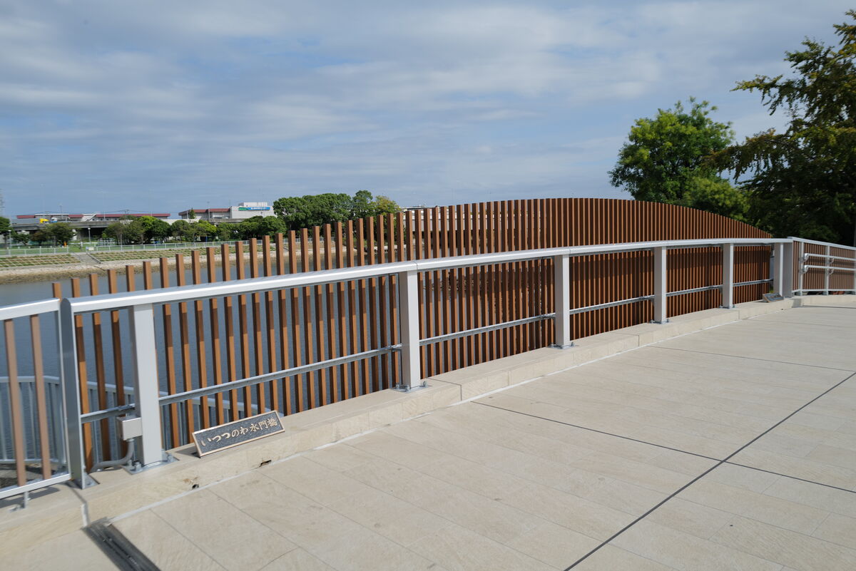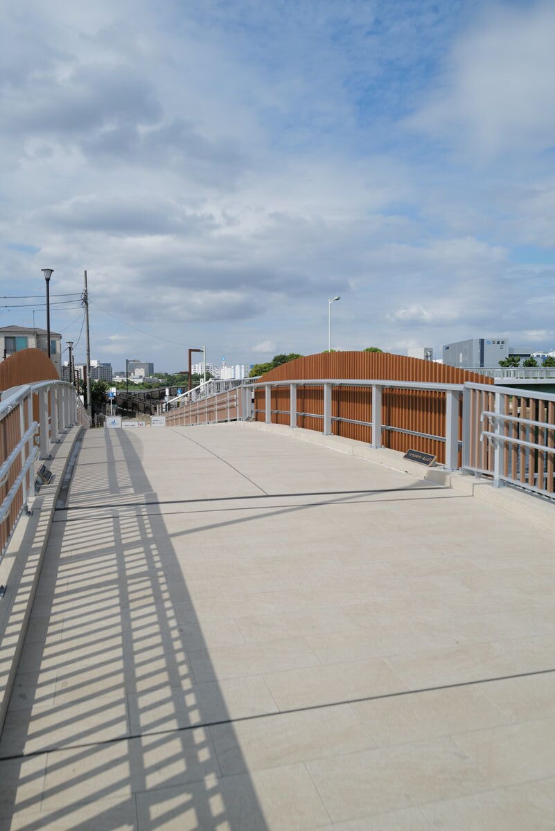 東京都大田区にある海辺の散策路へ、アルミユーティリティーズ『アルミフェンス P-GT』、ライン照明付き高欄、橋名板を納入しました。