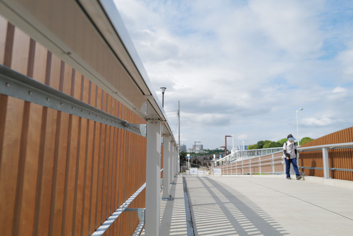 特注品として納入された高欄は、笠木部分にLEDライン照明を内蔵し、夜間の歩行者の安全性を高めています。