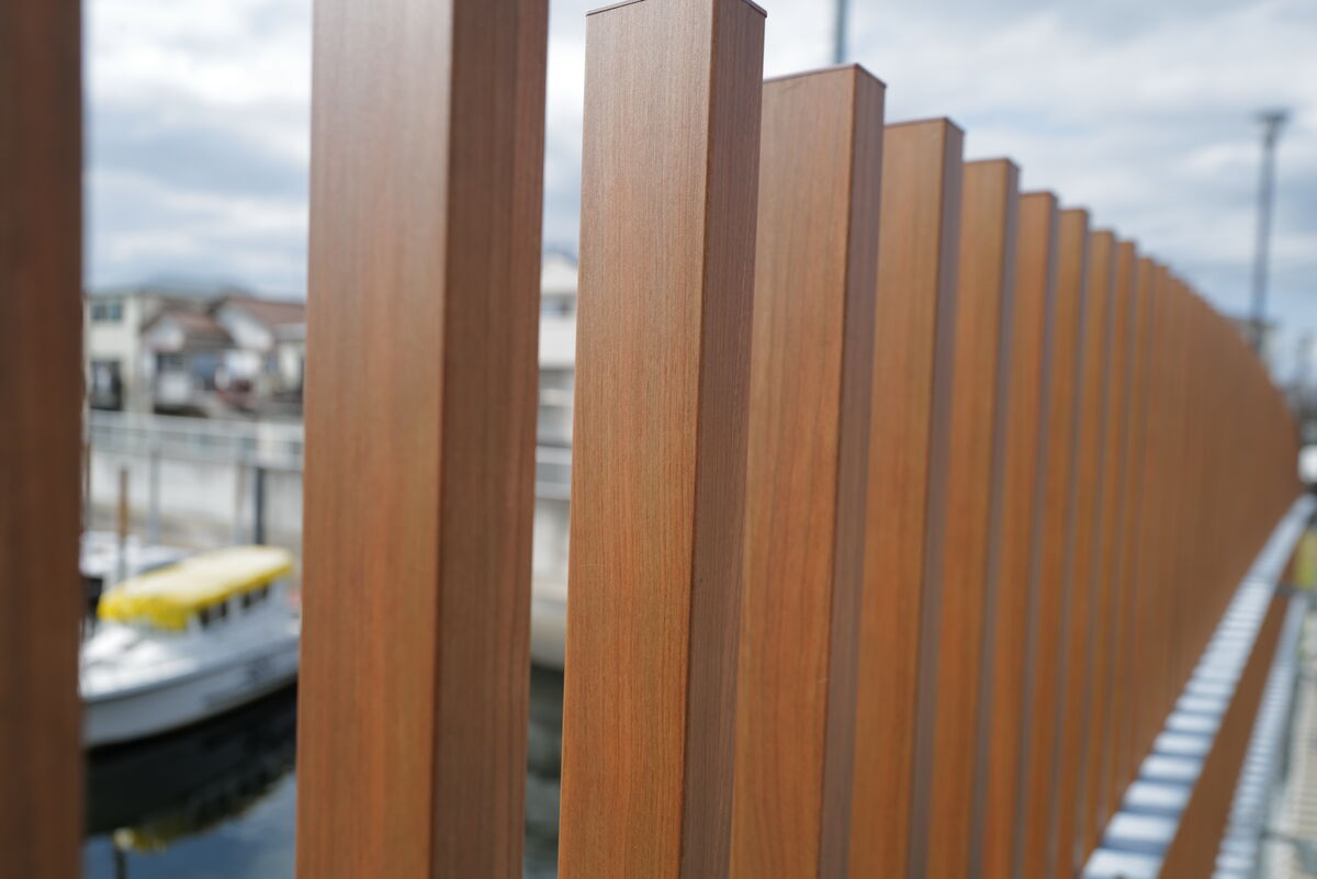 再生木材は木粉と廃プラスチックから作られ、天然木のような温かみのある質感を持ちながら、ささくれや腐食の心配がなく、耐候性に優れています。アルミ形材との組み合わせにより、軽量でありながら高い強度を確保し、水辺環境においても腐食の心配がありません。
