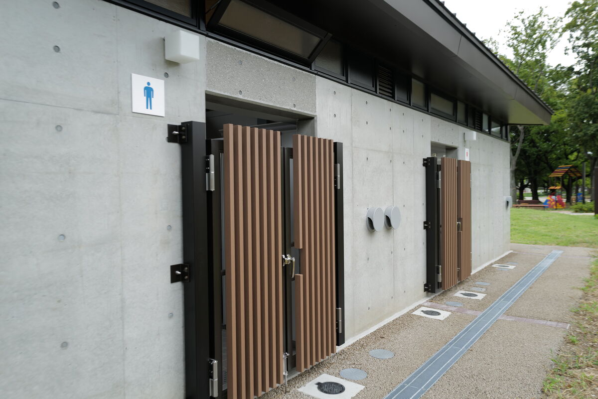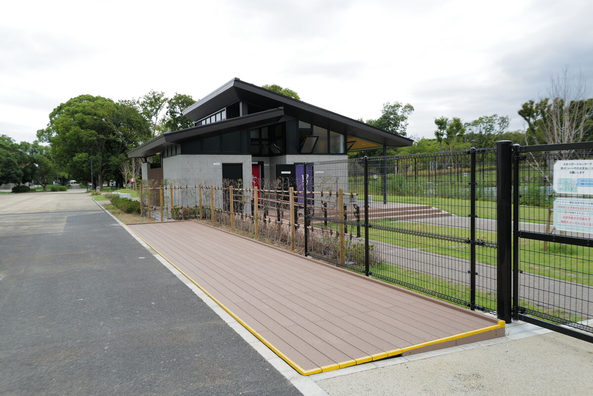 建物の外観、トイレ入口の扉にはルーバーフェンスを設置。施設へのアプローチとなるスロープと通路部分には『セコロウッドデッキ』を採用し、コンクリート舗装とは異なる木質感のある温かみを空間にもたらしています。