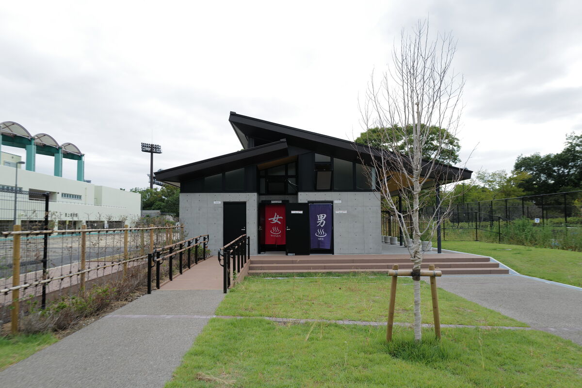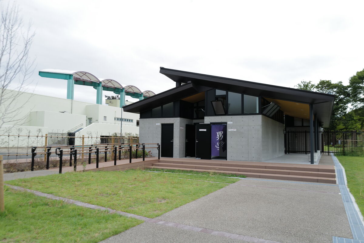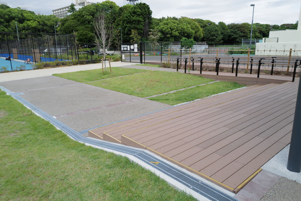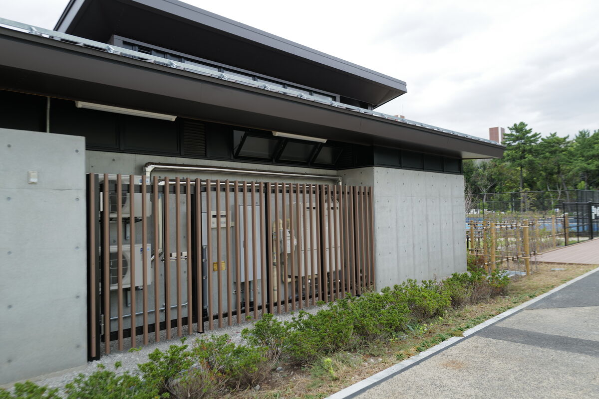 こちらの公園にある更衣室棟へ、再生木材製のルーバーフェンス『アルミユーティリティーズ STA』、再生木材デッキ『セコロウッドデッキ』、再生木材製ユニバーサル手すり『セコロウッド憩木』を納入しました。