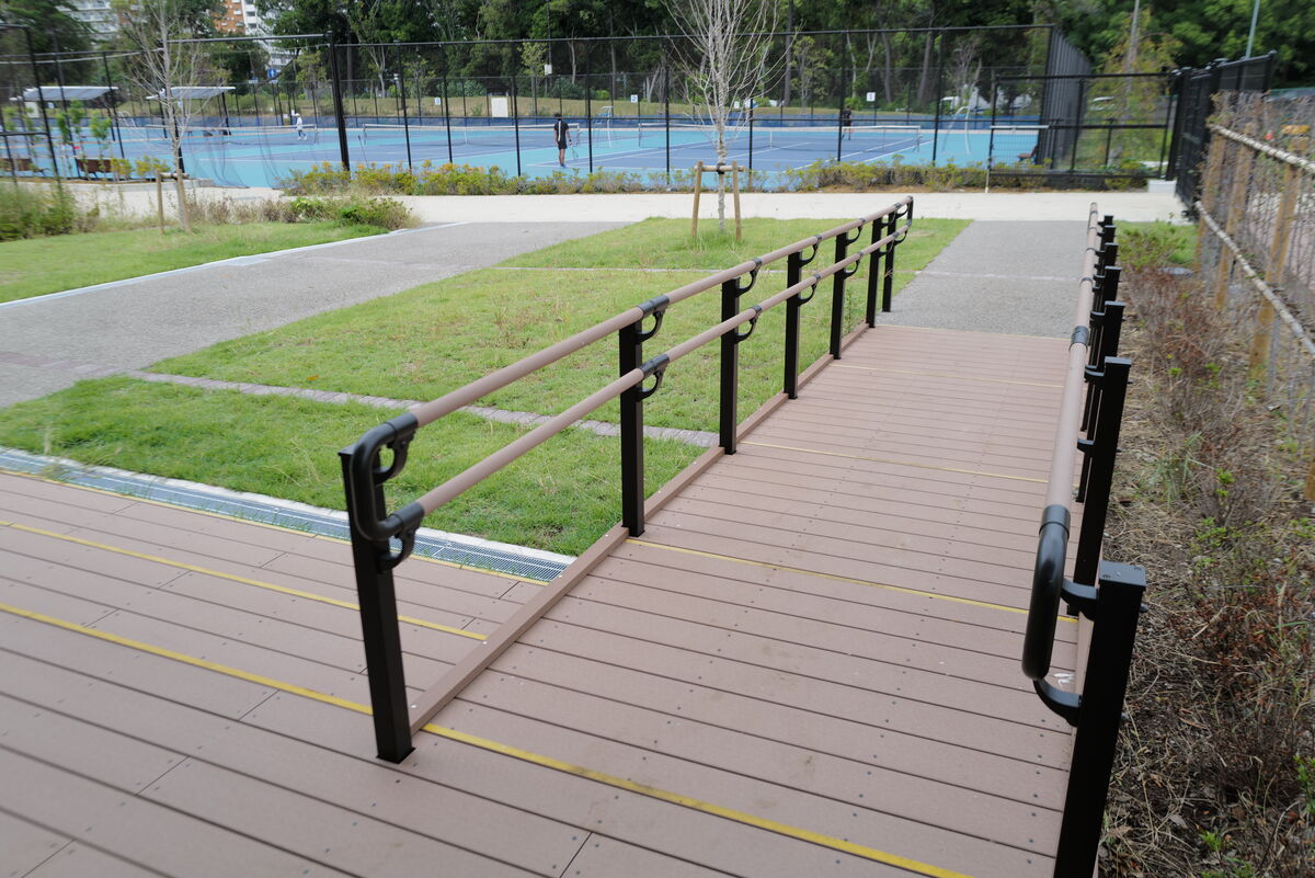 スロープには支柱□60角仕様の『セコロウッド憩木』を納入し、U字型の端末により服や鞄などが引っ掛かりにくい安心構造としました。