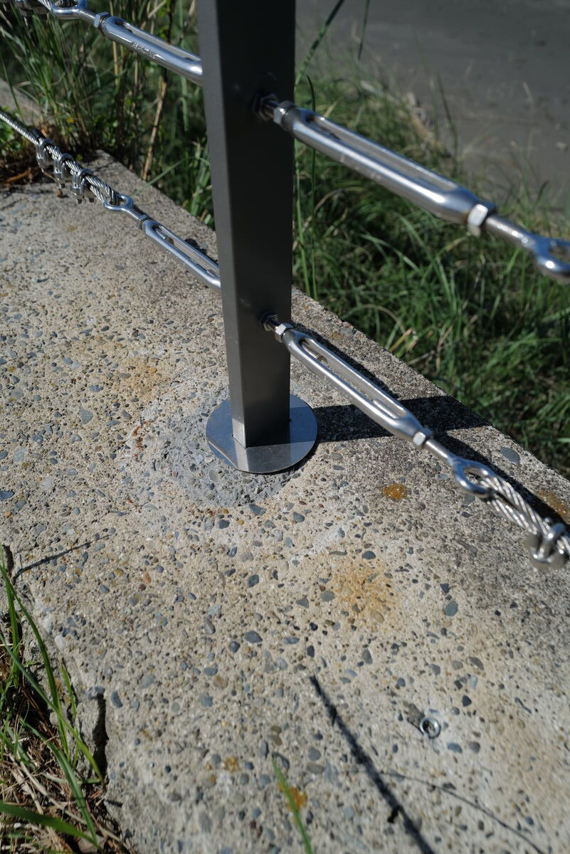 スチール材には溶融亜鉛メッキを施した上にステンレスフレーク含有塗料を使用し、ワイヤー関連部材にはSUS316を採用することで、海沿い特有の厳しい塩害環境に対応しています。