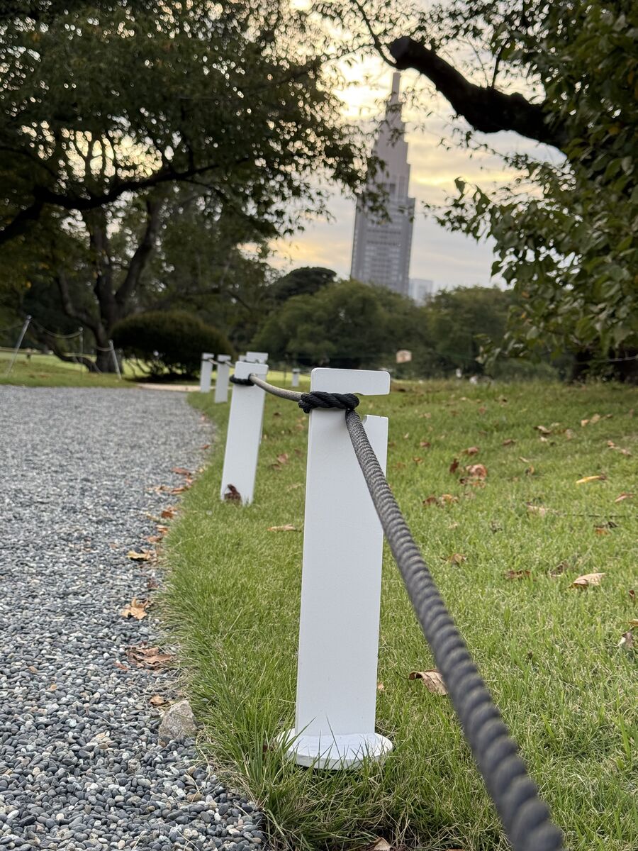 散策路に沿って納入したロープ柵は、園路と芝生広場の境界を明示しながらも圧迫感を与えないデザインが特徴です。低い高さに抑えることで開放感を保ちながら、来園者の動線を適切に誘導します。