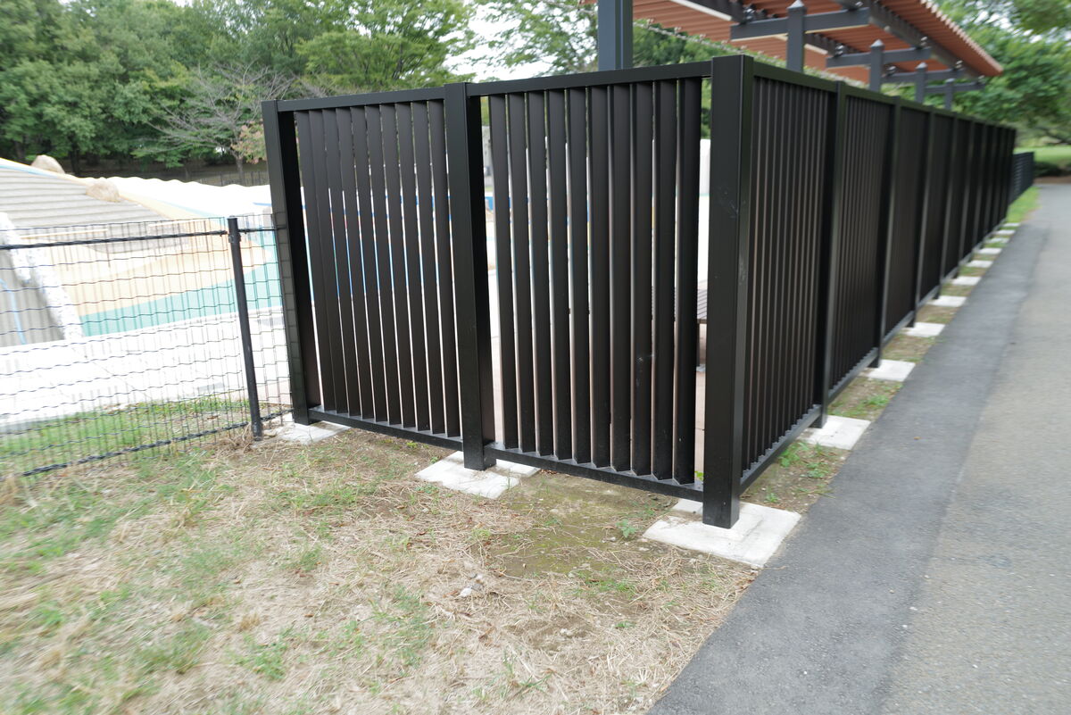 じゃぶじゃぶ池の周囲に納入された目隠しフェンスは、フラットバーで格子を構成した特注仕様です。