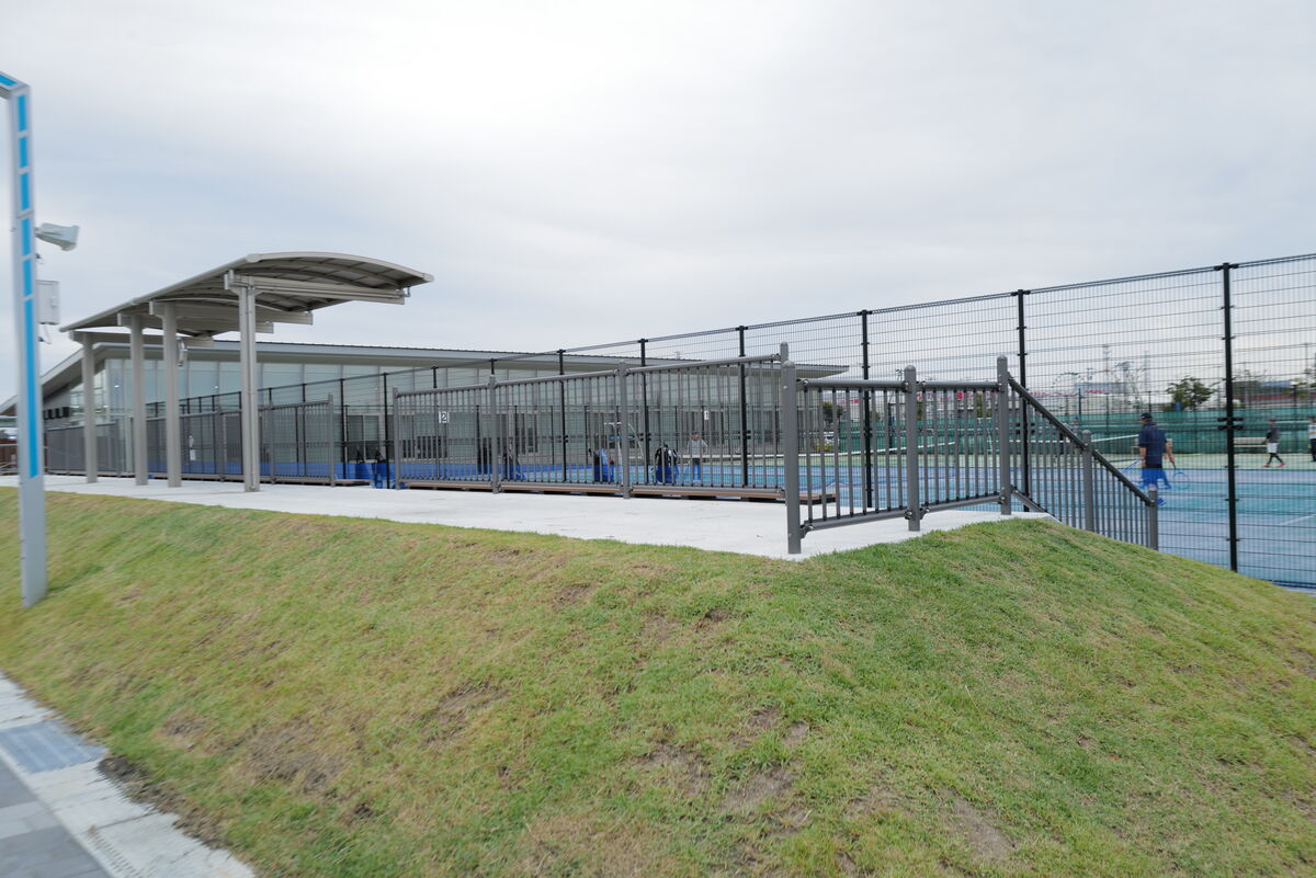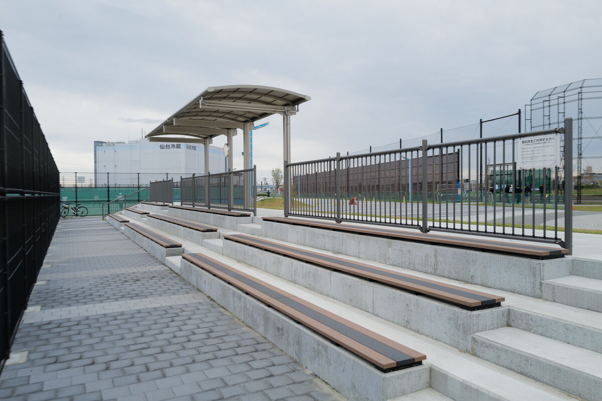 こちらの高砂中央公園のテニスコート観覧席および野球場観覧エリアへ、再生木材製座板ベンチとシェルター、転落防止柵を納入しました。
