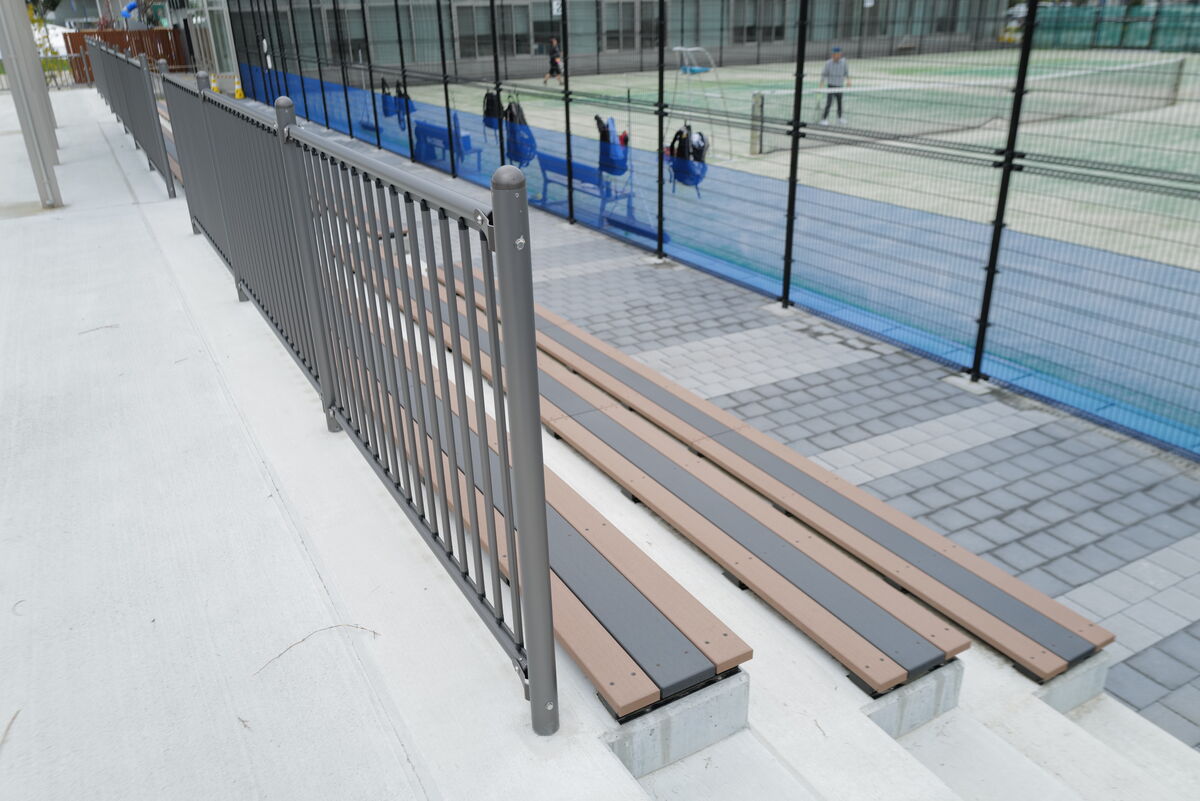 テニスコート観覧席には階段状のコンクリート躯体を活用し、再生木材のダークブラウンとブラックの2色を組み合わせた座板ベンチを納入しています。
