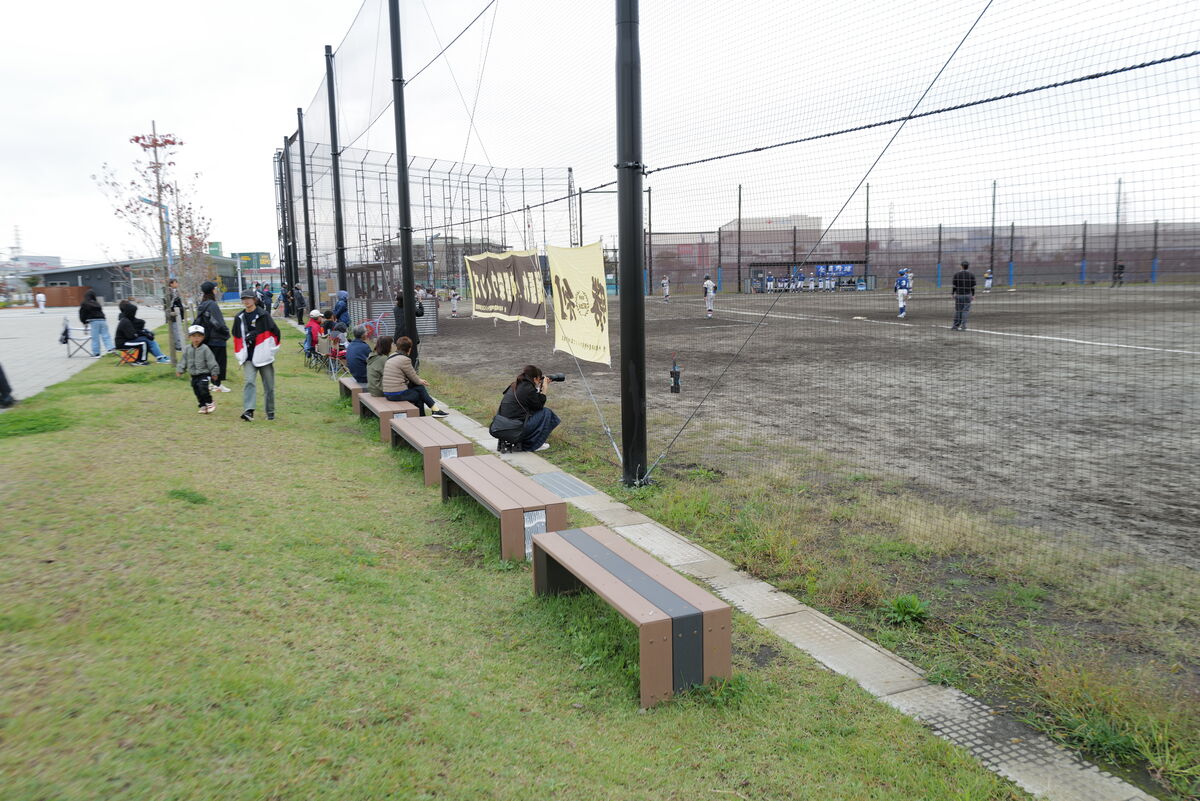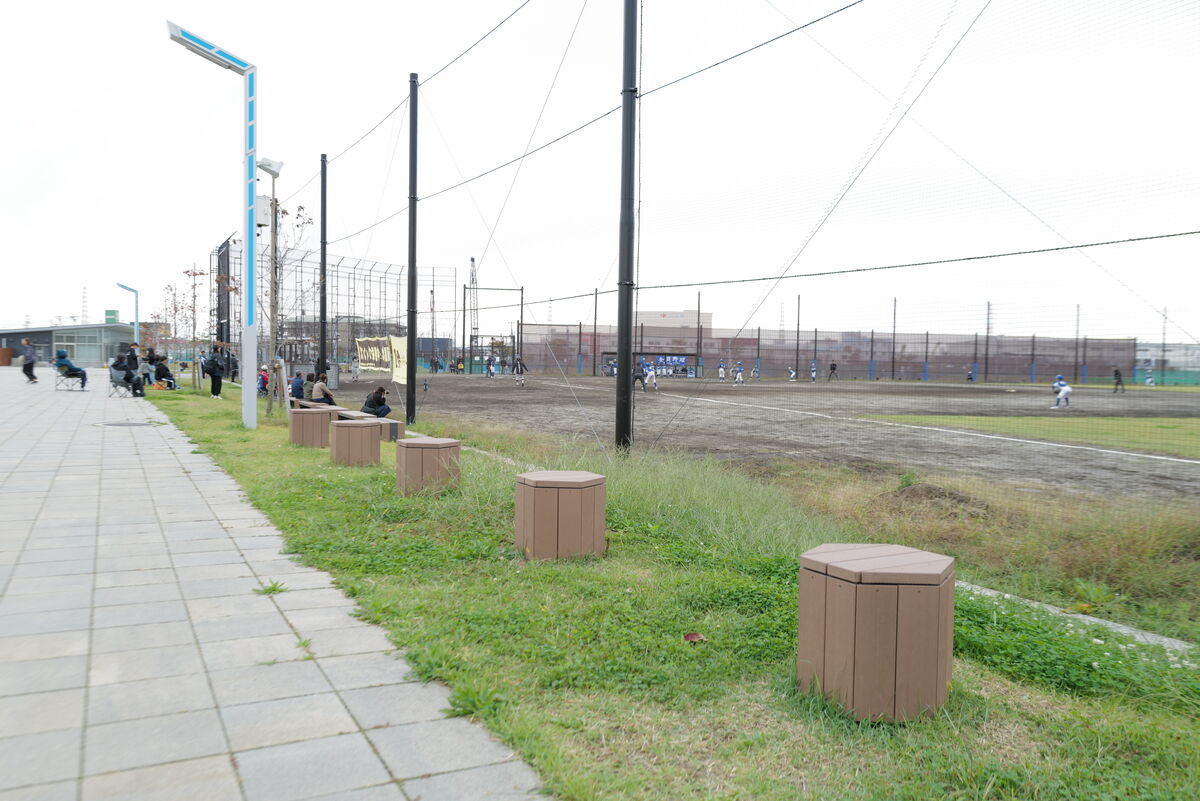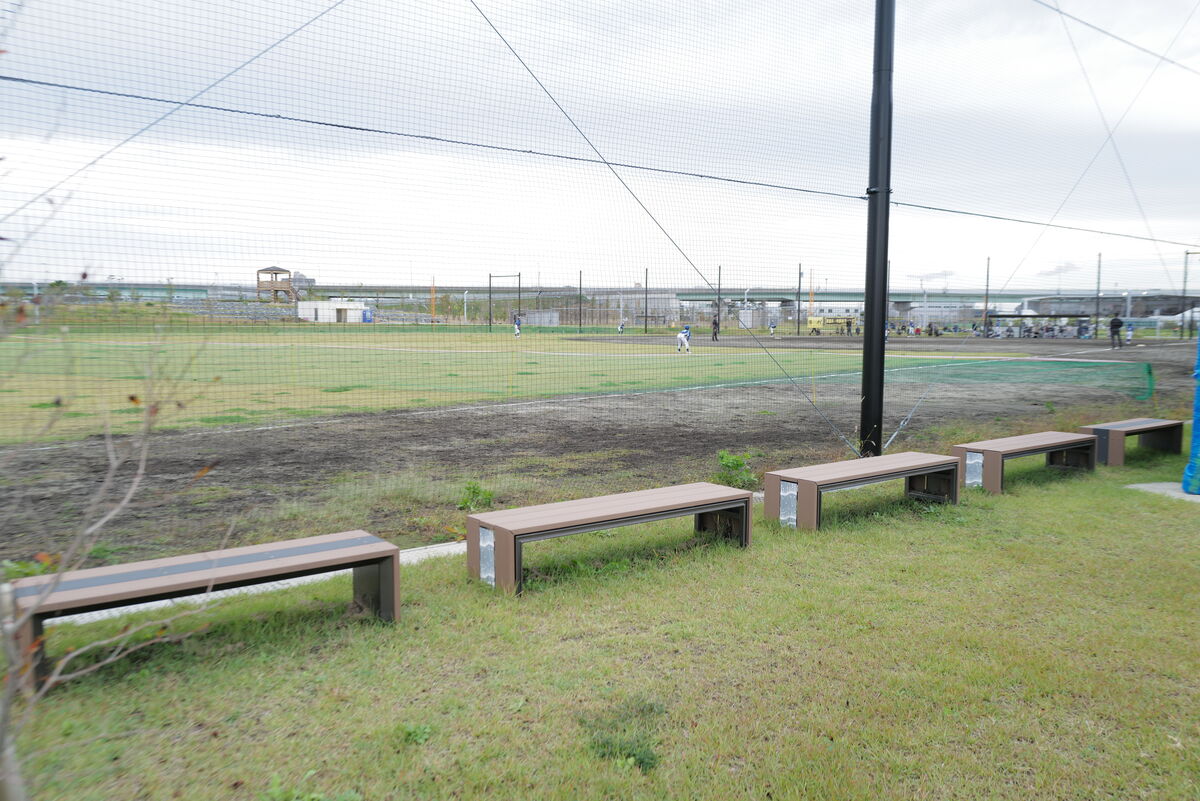 また、野球場の観覧エリアには、側面にデザインパネルを装着した門型ベンチを納入しました。この門型ベンチは同じ公園内の園路でも採用いただいている製品で、公園全体の意匠に統一感をもたらしています。