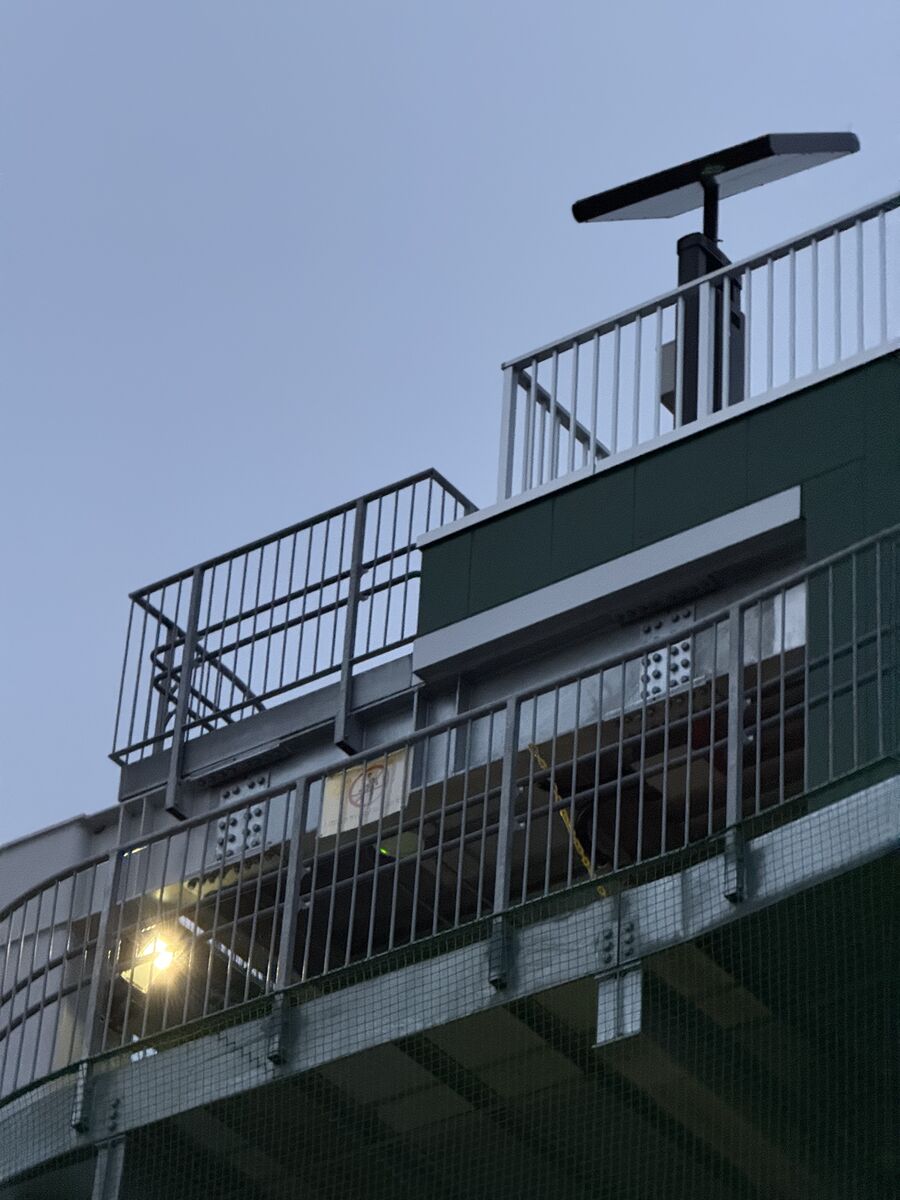 納入したソーラー照明システムは、屋上に設置された2基のソーラーパネル本体を中心として構成されており、ここから複数の避難用センサー付分離照明と屋内用天井灯具へ電力を供給する仕組みとなっています。