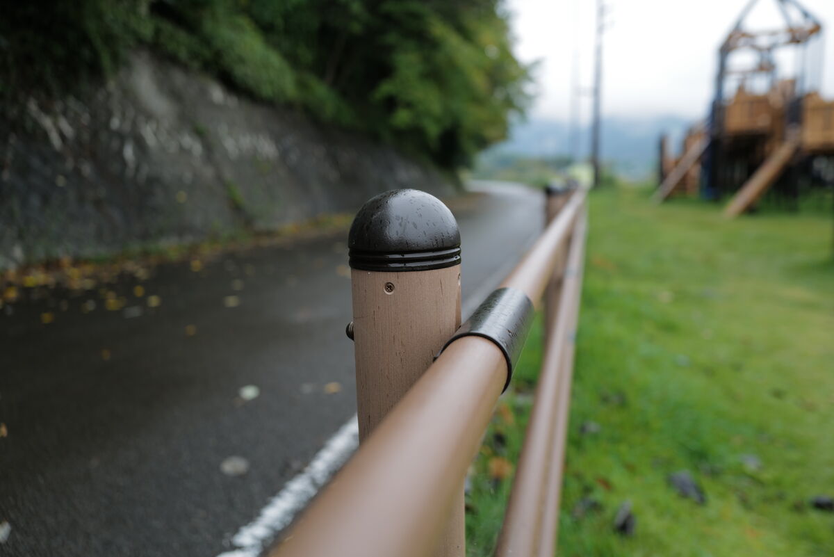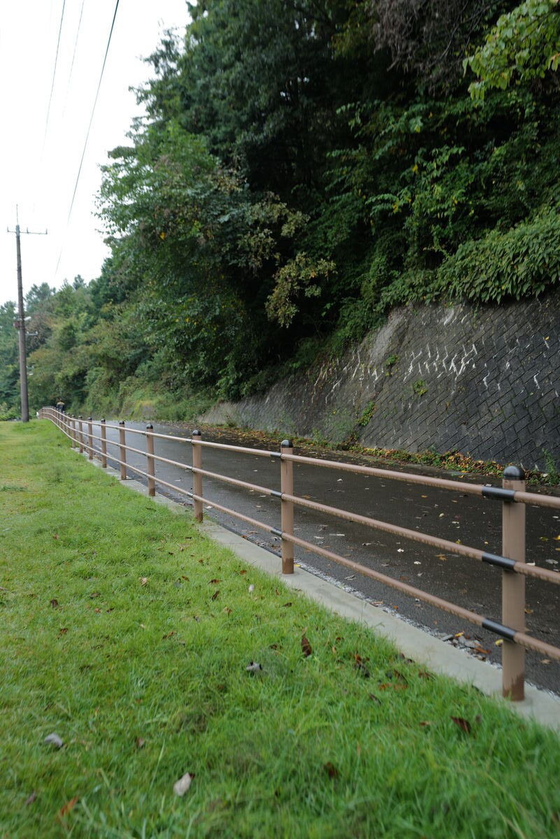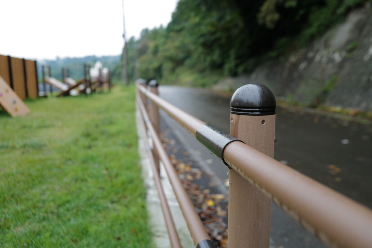 道路沿いには転落防止柵を納入しました。再生木材とアルミ形材を組み合わせた柵は、支柱から笠木、格子パネルまで一体感のあるデザインとなっています。