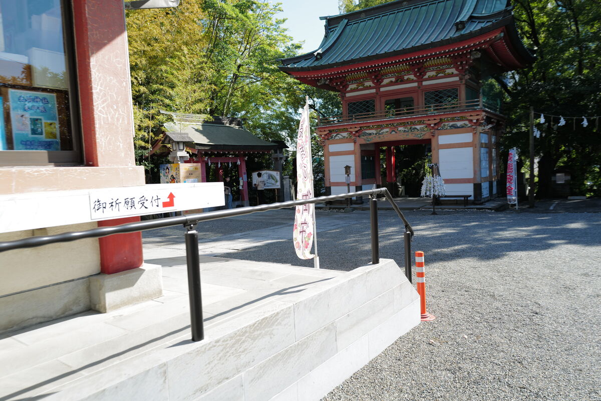 マットブラウンカラーのアルミ製手すりは、朱色の社殿や石段、砂利の境内といった神社の伝統的な雰囲気に自然と馴染み、参拝者の安全な昇降をサポートしています。
