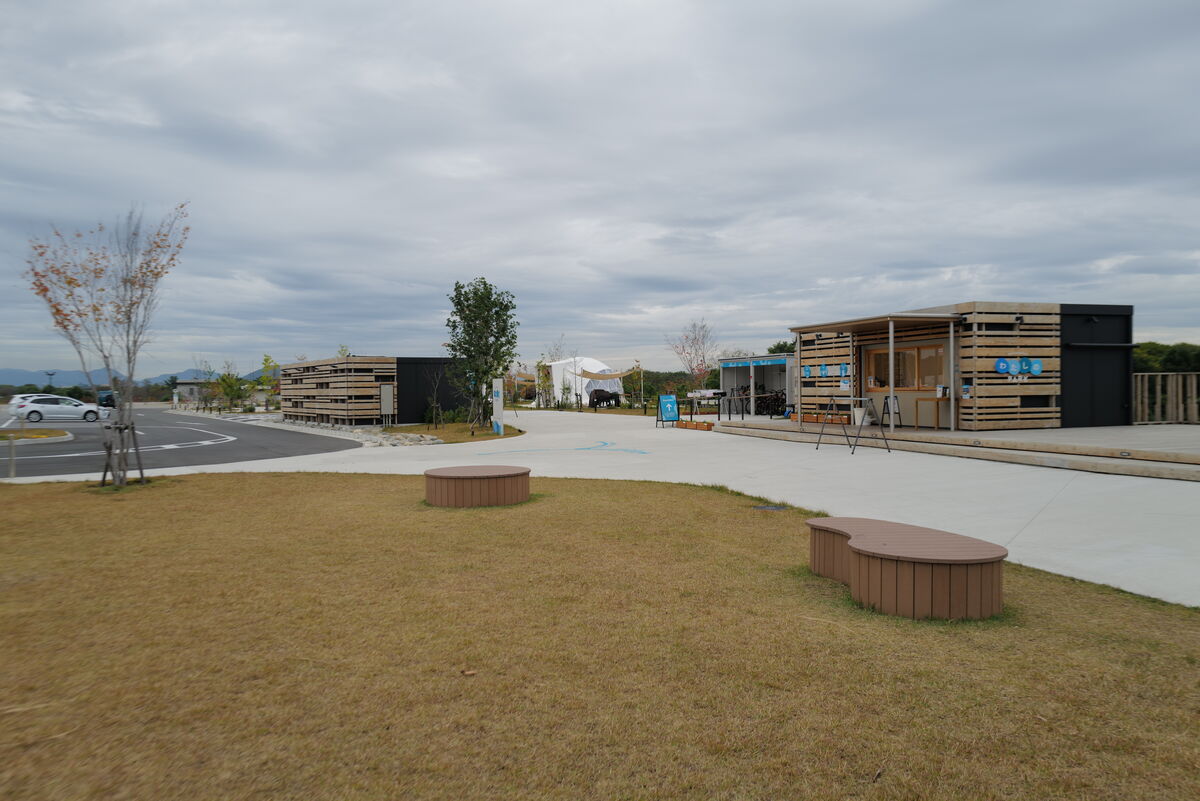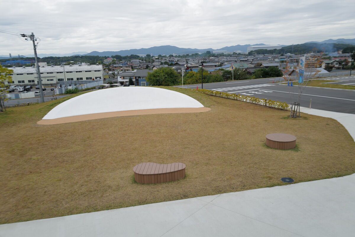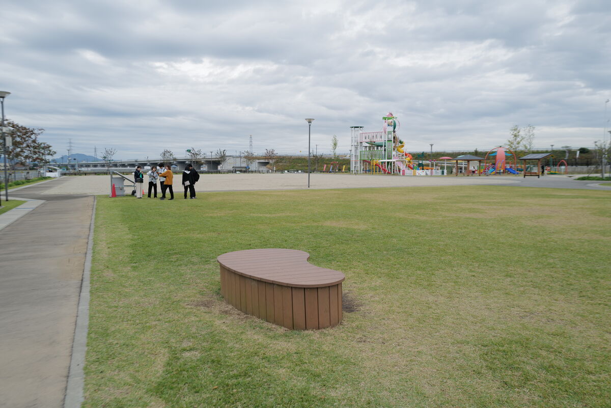 この公園の芝生広場に箱型ベンチ「ハコベン縁台丸」と「ハコベンソラマメ」を納入しました。