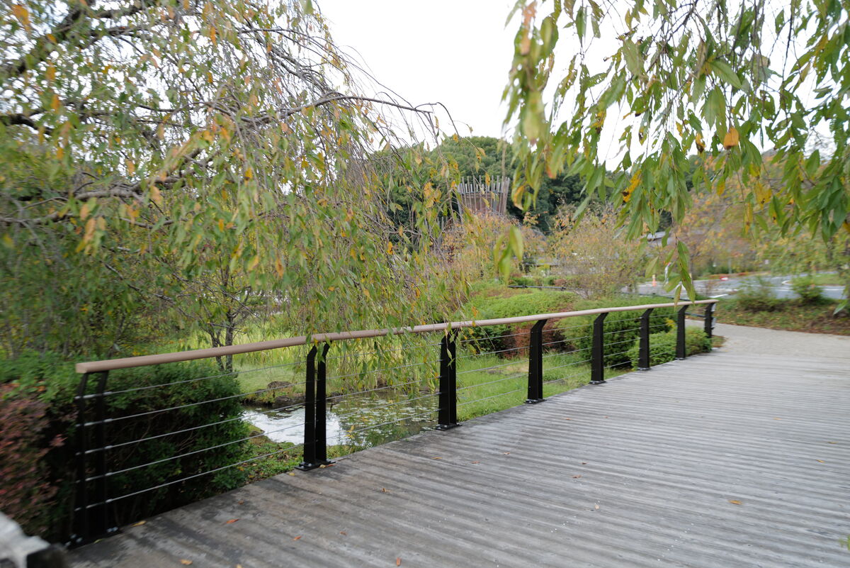 この公園の入り口部分に架かる橋において、ワイヤー転落防止柵を納入いたしました。