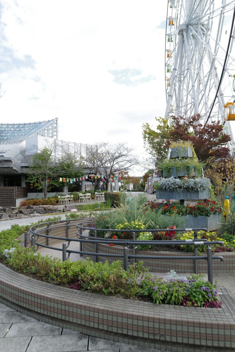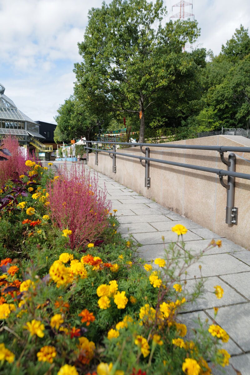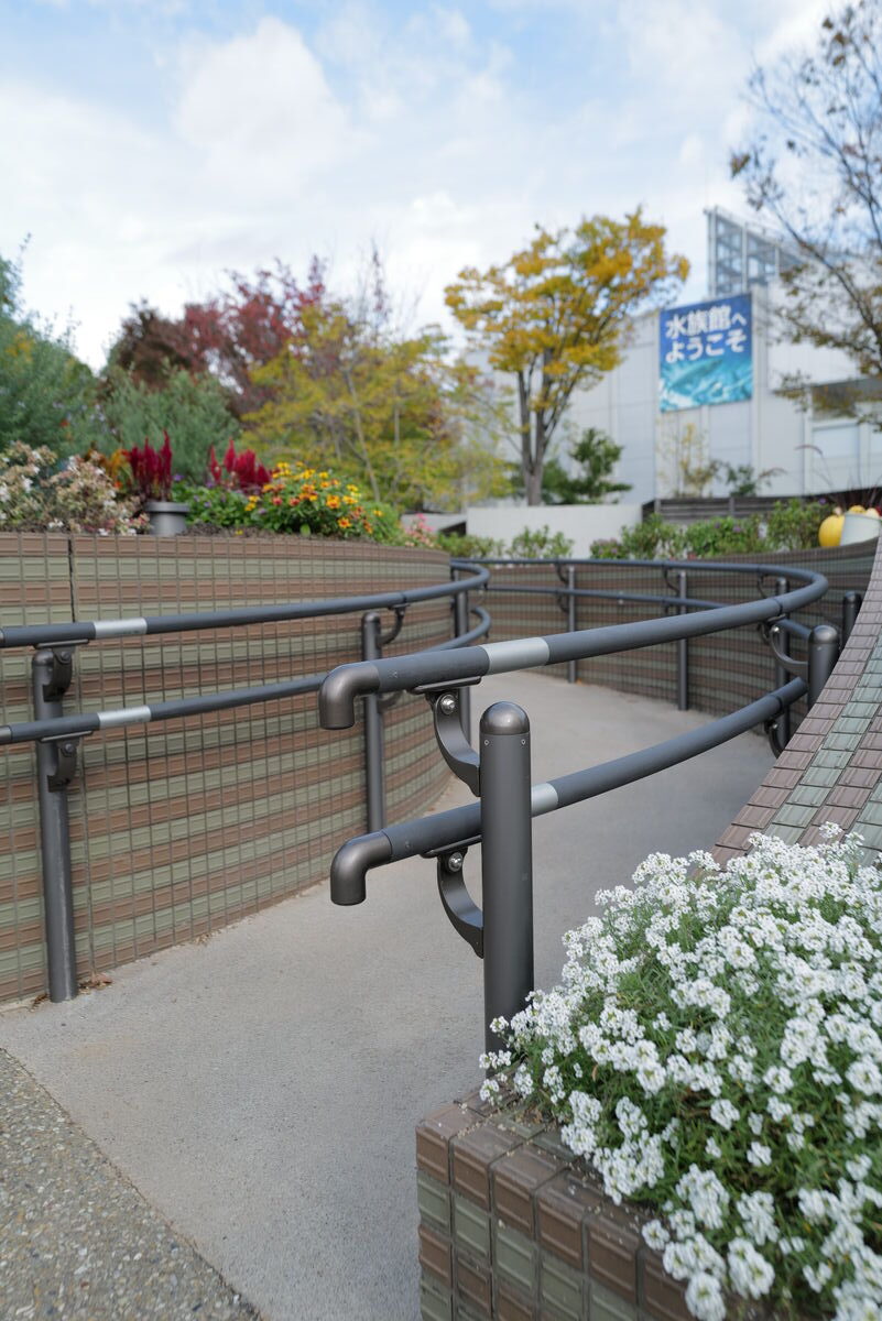 花壇の縁に沿ったカーブ部分には、手すりに曲げ加工をして曲線の園路にも途切れなく手すりを設けました。