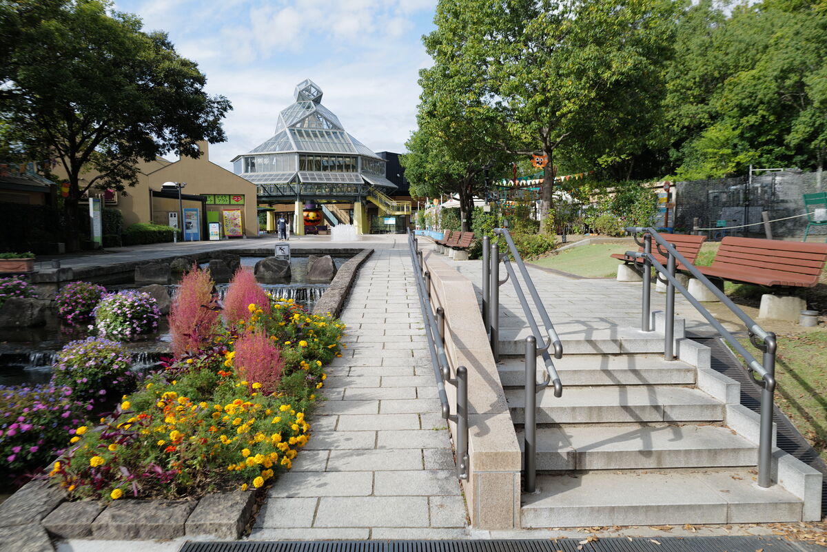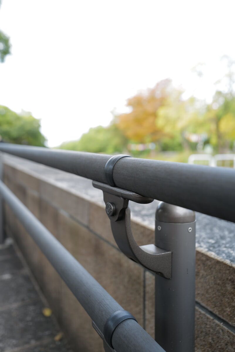 この園内動線のバリアフリー整備工事に合わせて、スロープや階段の安全な移動を支える再生木材製ユニバーサル手すり「セコロウッド憩木」を納入しました。