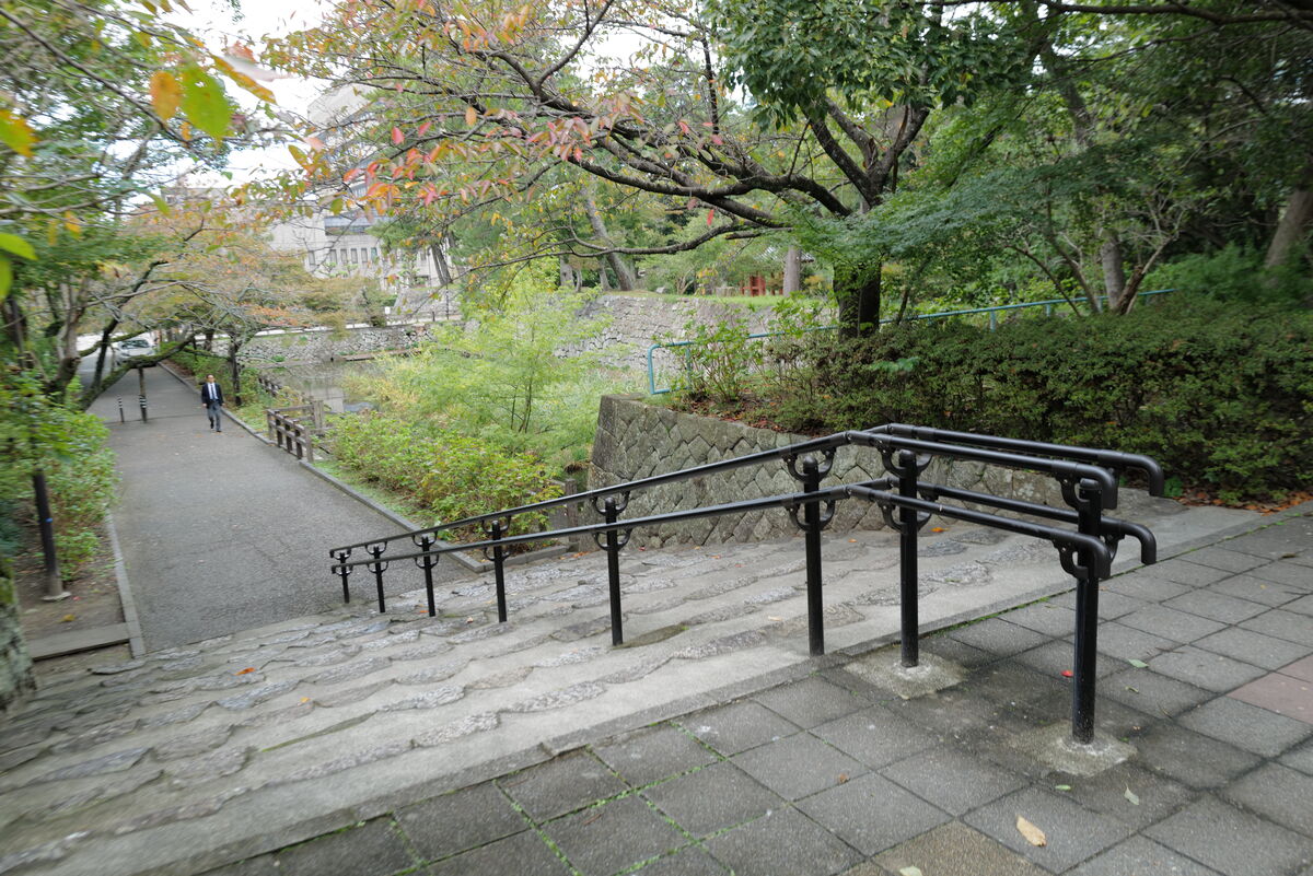 広場から高台へ上がる幅広い階段や、園路から斜面を登る細長い階段の両側に手すりを連続させることで、長い上り坂でも休みながら安心して昇降できる動線になっています