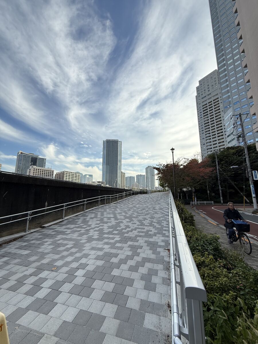 このスロープは、車いすやベビーカーにも対応するバリアフリー動線であると同時に、災害時には防災船着場まで4トン車がアクセスできることを前提に計画されています。