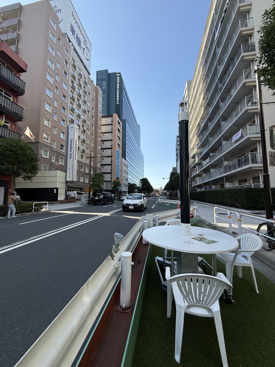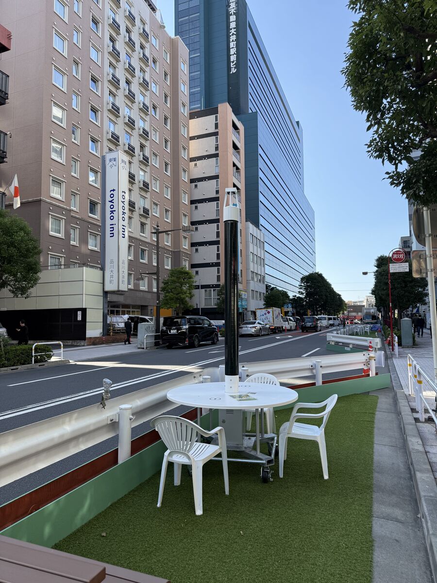 東京都品川区大井町で行われた社会実験「エンジョイ大井町 この道、実験中。」にあわせて、JR大井町駅近くの車道を一車線ずつ規制し、ガードレールと人工芝で囲ったパークレットが連続する区間に、独立電源搭載ピクニックテーブル「卓憩オンリー」を納入しました。