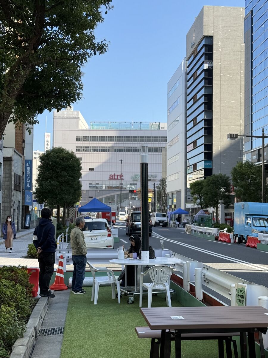 周囲にはホテルやオフィスビルが建ち並び、人通りの多い大井町駅周辺の街並みの中で、キャスター付きベースの卓憩オンリーが社会実験の期間やレイアウトに応じて場所を変えながら、通行人がふらっと腰掛けて飲食や休憩を楽しめる路上の「ちょい憩いスポット」として活躍しています。