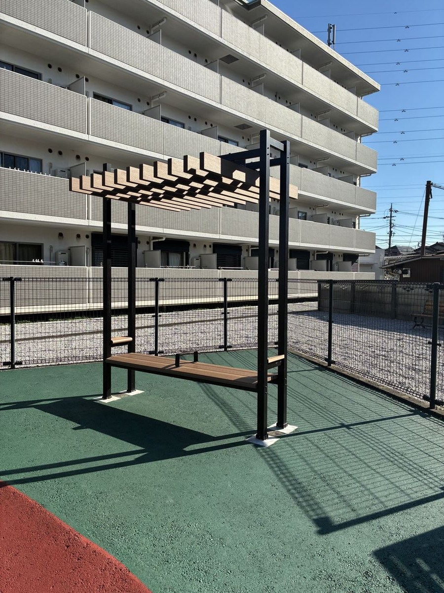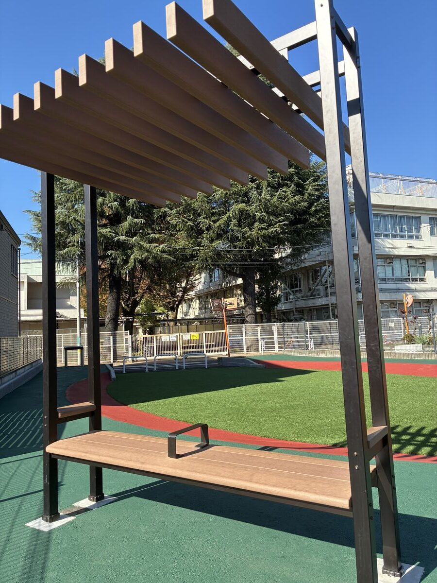 ベンチは木質感のある座板とシンプルな肘掛けを組み合わせ、学生や来訪者がスポーツや休憩の合間に腰掛けやすい環境となりました。