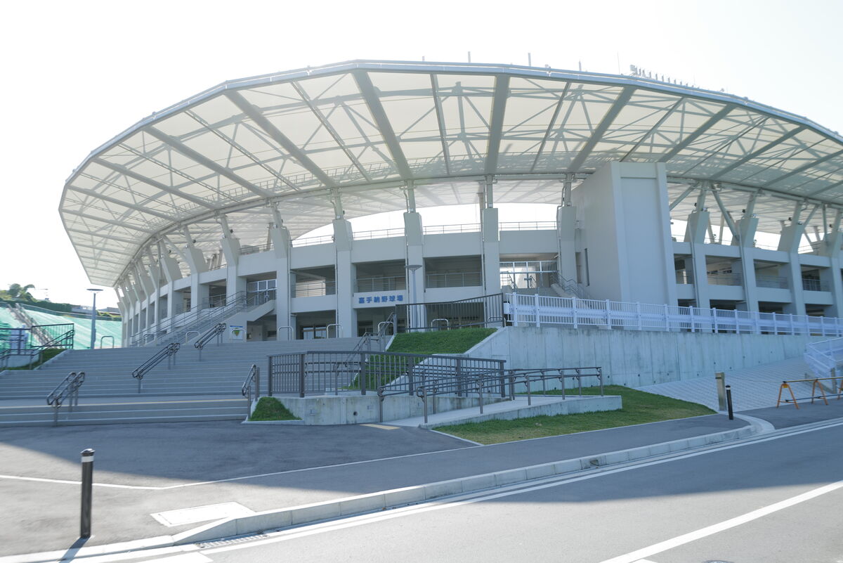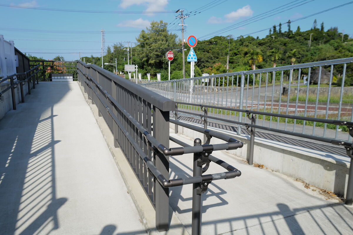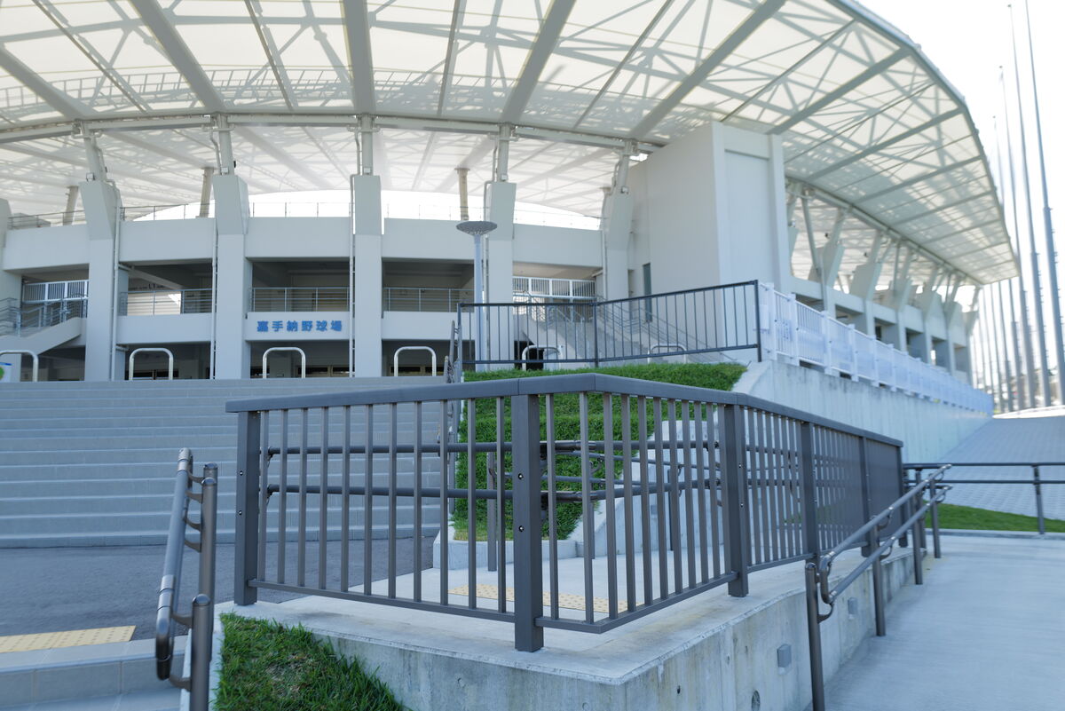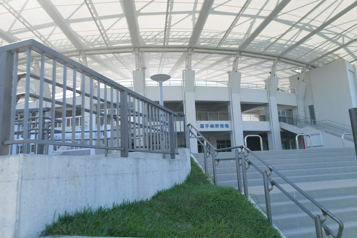 沖縄県中頭郡にある嘉手納野球場のメインエントランスへ続く階段・スロープの動線に、転落防止柵『ビスタ』と、ユニバーサル手すり『憩木』を納入しました。