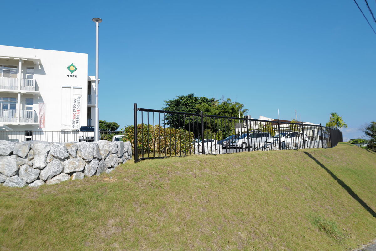 今帰仁村新庁舎でも、駐車場の見切りと法面の段差が続く区間に納入することで、歩行者と車両が混在しやすい庁舎外周の区画を明確にし、道路沿いの見通しを保ちながら転落防止の役割を担う構成になっています。