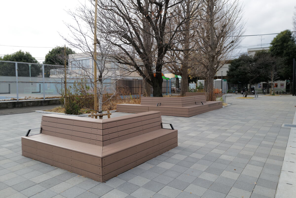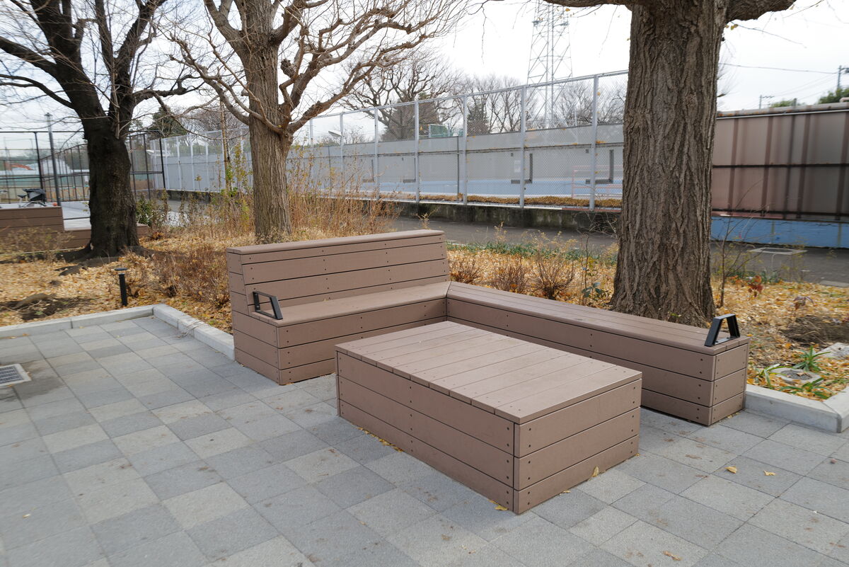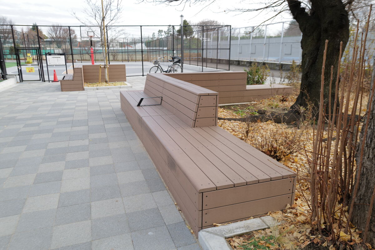 東京都世田谷区にある玉川野毛町公園の広場部へ、用途や設置環境に応じてさまざまな形態の再生木材製ベンチを納入しました。
