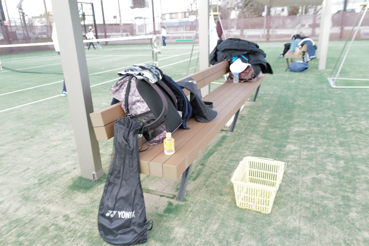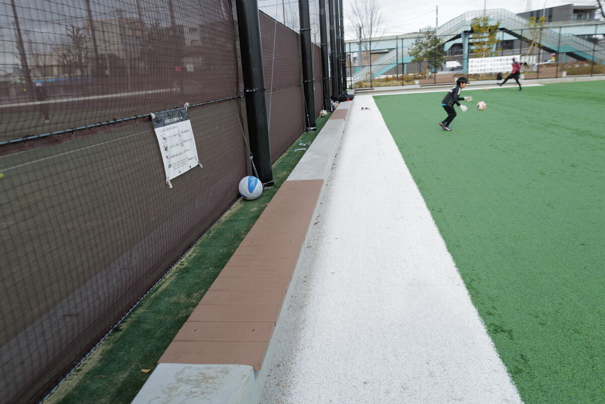 コンクリート擁壁と一体化したL型縁台ベンチは、スポーツコートを見守りながら休憩できる配置となっており、背もたれと肘掛けを備えた仕様で快適な座り心地を実現しています。