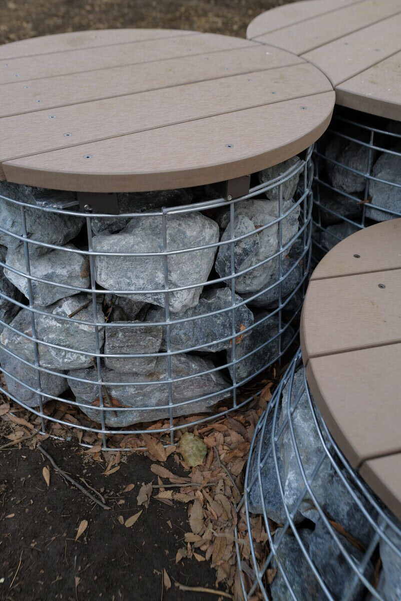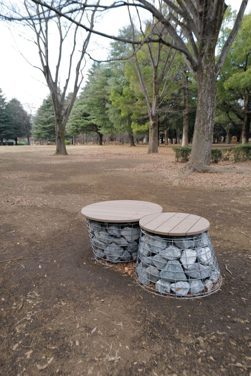 これらのベンチは、ワイヤーメッシュの籠に自然石を充填したガビオン構造を脚部に採用し、その上に再生木材『セコロウッド』製の円形座板を組み合わせた独創的なデザインです。
