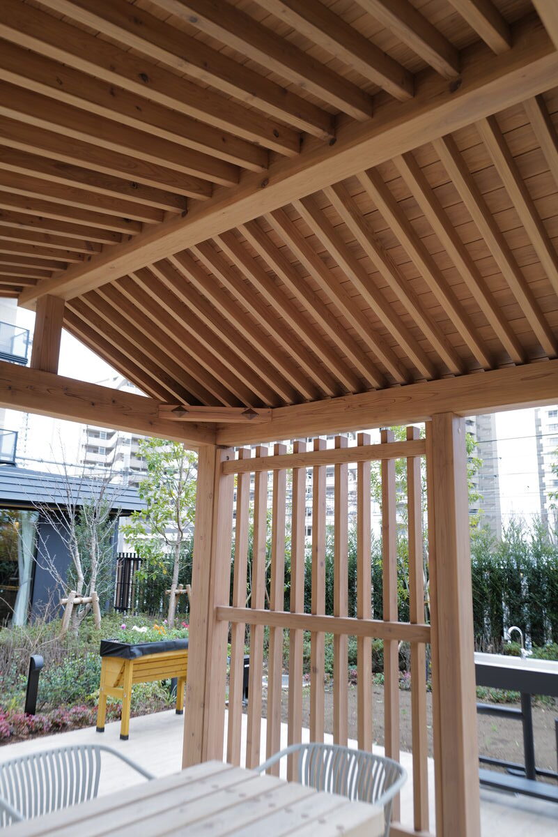 納入した東屋は、オール木材の杉材で構成された特注品で、幅3850mm、奥行3230mm、高さ3400mmの規模を持ち、切妻屋根の芯をセンターからずらした意匠的な設計が施されています。