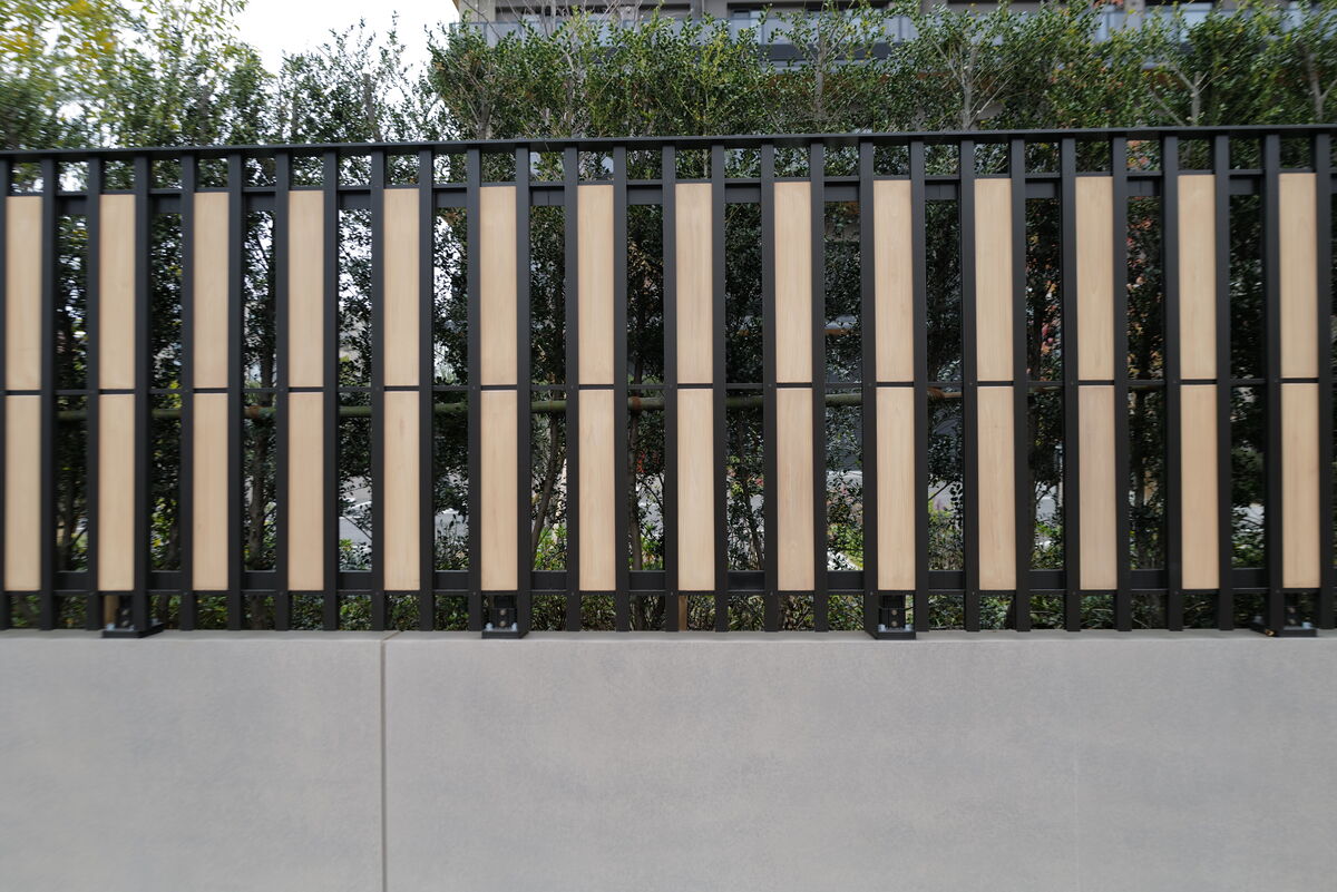 こちらはアルミユーティリティーズ「STA」シリーズの支柱と胴縁の仕様をベースとしながら、格子部分を高さ40mmのアルミ材に変更し、その間に淡い色合いの杉板を組み込んだ独自の設計です。