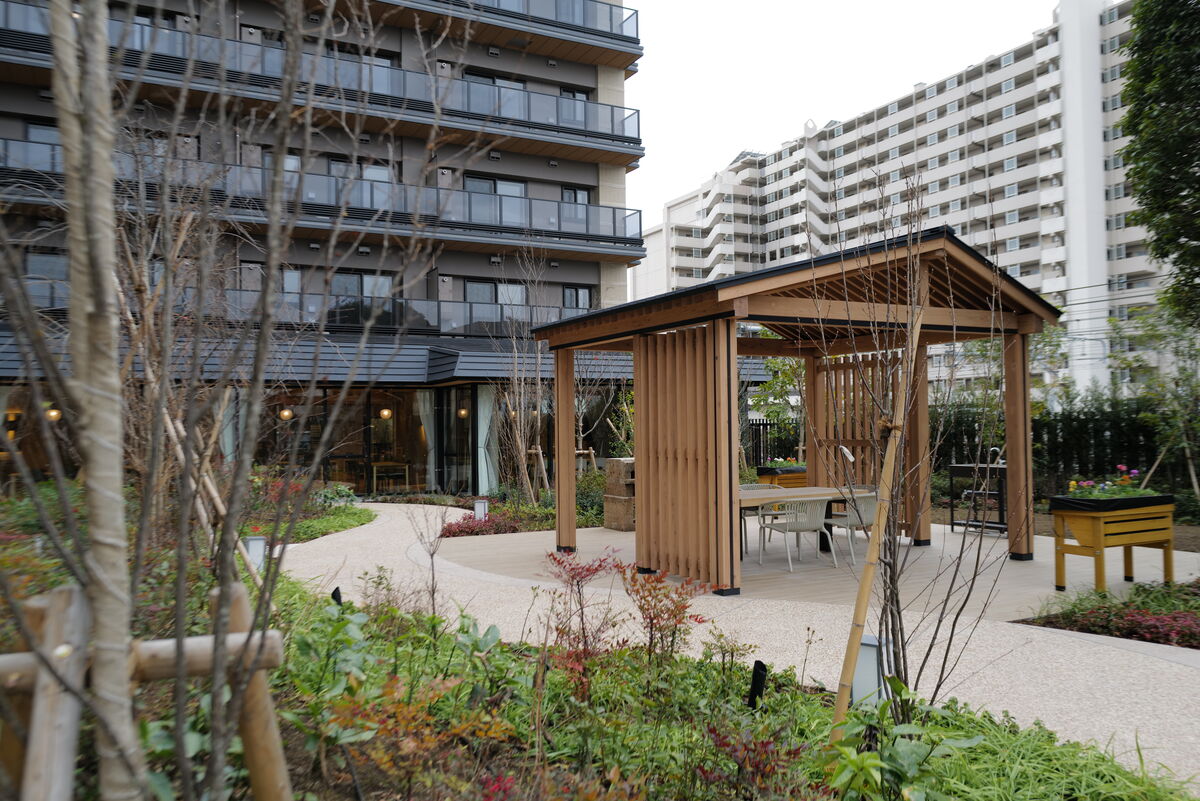 さいたま市の福祉施設外構整備において、特注仕様の天然木材製東屋と特注アルミフェンスを納入しました。