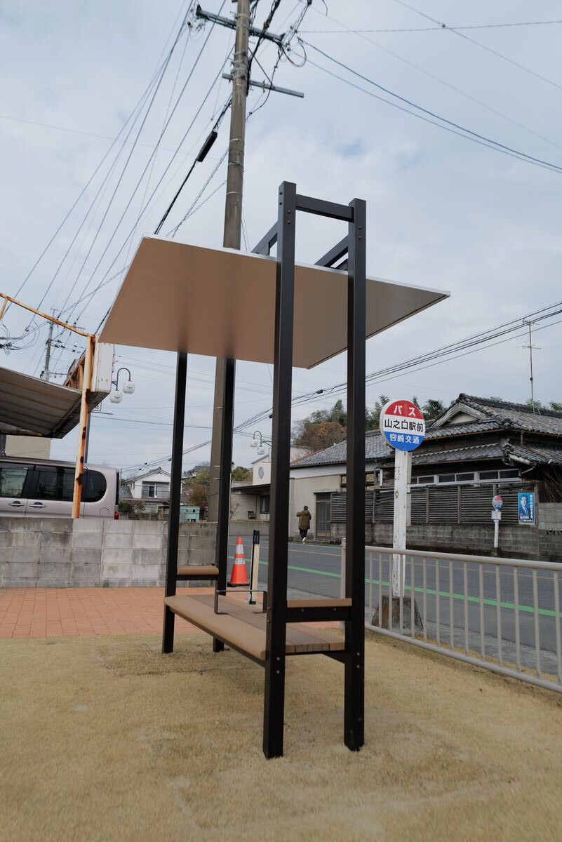 バス停の待合所として機能するこの製品は、屋根とベンチが一体となった構造で、利用者が天候に左右されることなく快適に待ち時間を過ごせる空間を提供します。