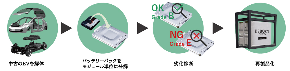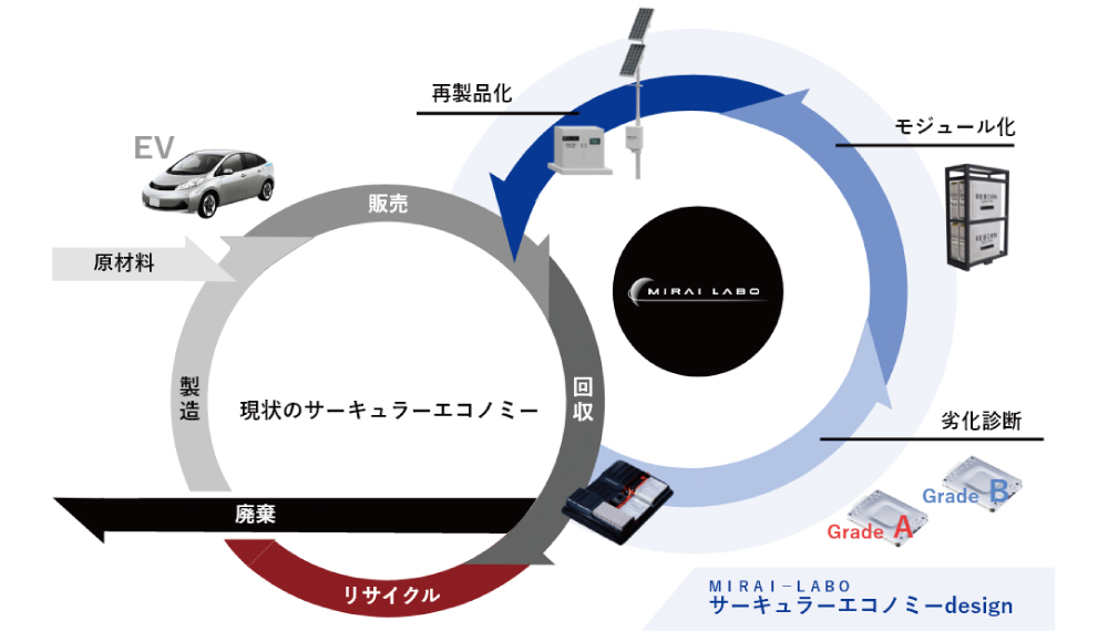 現在、電気自動車に使用されているリチウムイオン電池の効率的なリサイクル方法は確立されておらず、海外へ流出するか廃棄されている状況ですが、リサイクル技術確立までの間、車以外の用途にリパーパス、つまり再製品化することで、EVのサーキュラーエコノミーの実現に貢献します。