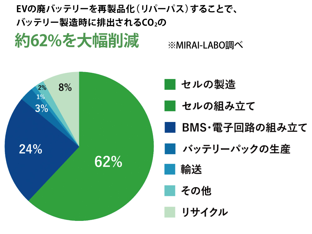 使用済みの電気自動車から取り出されたバッテリーパックをモジュール単位に分解し、劣化診断を経て再製品化することで、新たなバッテリー製造時に排出されるCO2の約62%を大幅に削減することができます。